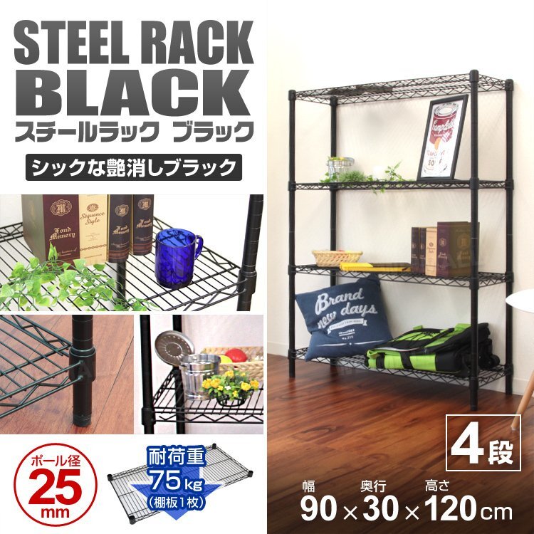 ぐらつき防止アジャスター付き! クギやネジを使わずに簡単に組み立て出来ます! 棚の高さを自由に変えることができます。 一人暮らしのお部屋やリビング、キッチン、物置など場所を問わず活躍できます。 錆に強いパウダーコーティングで水回りでの使用も◎ アパレルショップの店頭用やオフィスにも使用されています。 【仕様】 サイズ(約):幅90×奥行30×高さ120cm 耐荷重(約):(全体)330kg / (棚板1枚あたり)75kg 材質:スチール(クロームメッキ)、ABS樹脂他 重量(約):10kg カラー:ブラック 【商品内容】 シェルフ(棚板) ×4 ポール(上下2本1組) ×4 スリーブ(2個1組) ×16(+予備付属) 【もちろん新品未使用品です】 |