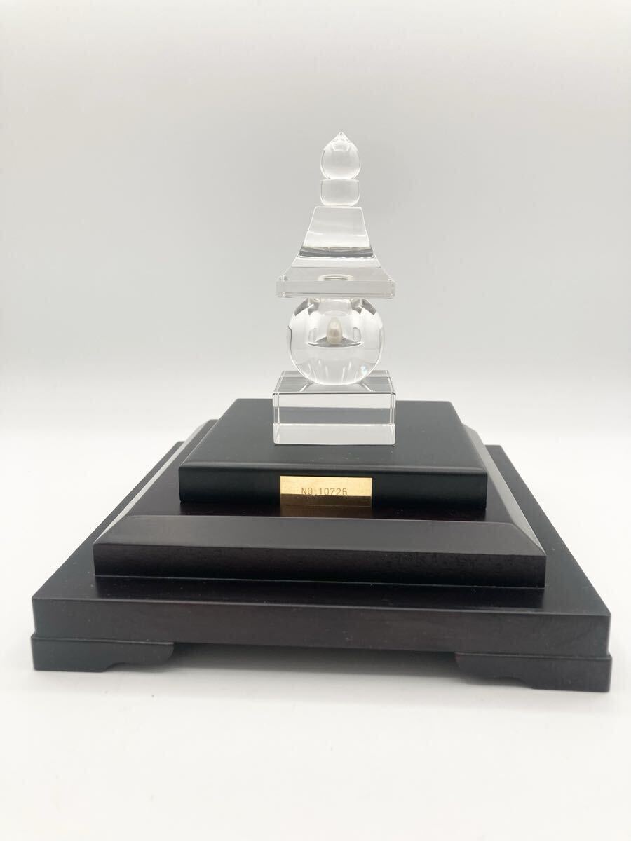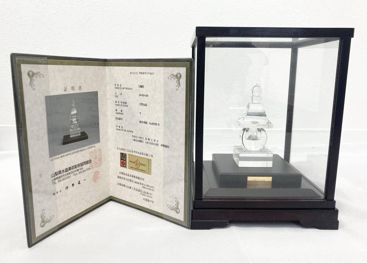 1円スタート 水晶 置物 インテリア 五重塔 ガラスケース付 天然水晶 伝統工芸 硬度7 和風 証明書 1204K④