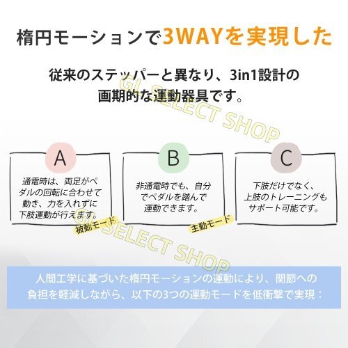 • 【楕円モーションで3Wayを実現した】従来のステッパーと異なり、3in1設計の画期的な健康器具です。人間工学に基づいた楕円モーションの運動により、関節への負担を軽減しながら、以下の3つの運動モードを低衝撃で実現:座りながらウォーキング--(後ろ漕ぎを推奨)脂肪燃焼効果/ 体幹強化/下半身シェイプアップ※安定した姿勢で初心者も安心!サイクリング-運動不足解消/ 内もも引き締めで美脚効果。