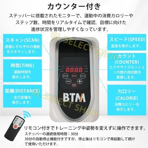 • 【カウンター付き】ステッパーに搭載されたモニターで、運動中の消費カロリーやステップ数、時間をリアルタイムで確認。目標に向けた進捗状況を管理しやすくなっています。リモコン付きでトレーニング中姿勢を変えずに操作できます。ステッパーの連続使用時間:30分。30分の自動停止機能付きですが、停止後はリモコンで再起動して続けて使用いただけます。