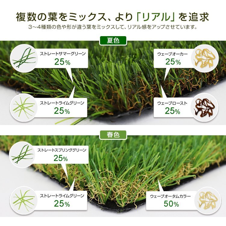 | 素足で歩きたくなるやわらかさ。 ロール状の人工芝です! 本物の天然芝と見間違えるほどのリアル感!! 人工芝なので枯れる心配も無ければ、メンテナンスもほぼ不要。 年間を通してきれいな緑が素晴らしい景観を保ちます。 水抜き穴が空いているので水が溜まる心配はありません。 はさみ等で簡単にカットすることが可能です。 固定に使えるU字ピン付き! 芝生のズレをしっかり防いでくれます♪ ■商品コード:AAI0110E ■商品仕様 カラー:夏色 サイズ:(約)幅1m×長さ10m×毛足3.5cm 重量:(約)25kg 素材:PE(ポリエチレン) 【夏色】 ストレートグリーン 25% ストレートライトグリーン 25% ウェーブグリーン 25% ウェーブオータムカラー 25% ■内容 人工芝 ×1 ■注意事項 ・2023年7月以降「夏色」の色味変更のため、2023年7月以前の仕様(旧タイプ)と異なっております。 追加でご購入される場合はご注意ください。 ・ロールタイプのため、寝癖がつく場合がございます。 ・長時間、直射日光にあたっておりますと、高温になる場合があります。 ・光の当たり方や芝が寝ている場合、ラインが入っている様に見える場合がございますが、品質不良ではございません。 ・人工芝は材質の特性上、夏の暑さや冬場の寒さにより長さに対して約1%程度伸縮する可能性があります。 ・商品は、モニターによって色合いが異なって見える場合があります。 ・仕様・デザインは改良のため予告なく変更することがあります。 ■保障期間 7日間 ※商品到着後7日以内の初期不良・破損のみご対応させていただきます。 【新品未使用品です】 |