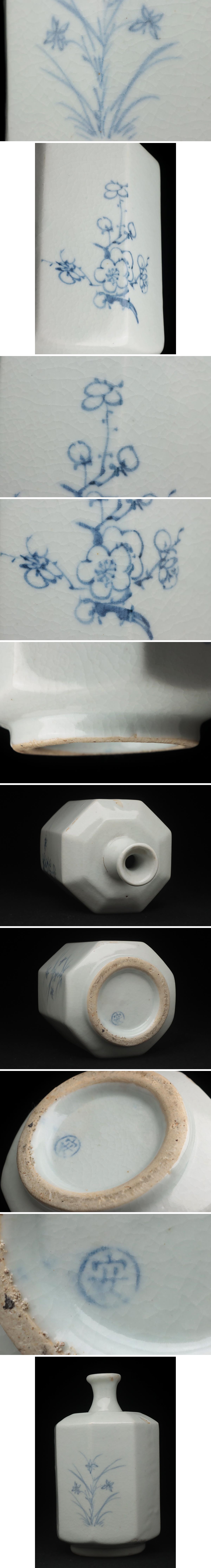 | ◆ 韓国美術【韓国人間国宝 安東五 作】樊川窯 李朝 白磁染付 梅蘭文 面取八角瓶 高19.1cm・花瓶・花入 韓国陶磁 ◆