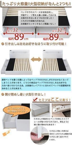 | 商品紹介 | + ダブルマットレス ○大人気のベッドシリーズ!! 【ベッド】 ●ベッド下に大型の引き出しが2つ設置されています。 ●ヘッドボードには電源コンセントを2個口、側面収納を完備。 ●桐を使用したすのこを採用し、通気性も◎。 ●表面は鏡のように美しい鏡面加工です。 ●素材:MDF(ベッド本体) 桐(すのこ) ●塗装:ラッカー塗装(鏡面加工) ●電源コンセント(2個口):合計で1500ワットまで使用可。 ●電源コンセント用プラグが1本(長さ約176cm)付属。 ●重量:約84kg 【マットレス】 ●ファイバー・ウレタンフォーム・ラテックス・フェルト・ポケットコイルなどの贅沢な8重構造でピロートップになっているマットレスです。とても肌触りもソフトで、快適・適度な弾力性のマットレスです。 ●天然ラテックスを使用しており、体にも優しくフィット!! ●682本のポケットコイルを使っており、体に適度にフィットする機能を持ち、疲れた体を十分にほぐしてくれます。 ※こちらの商品は、組立て式です(組立てに必要な工具は付属しています)。 |