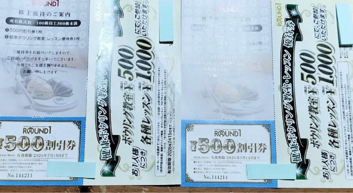 ☆送料無料☆ラウンドワン株主優待券 500円割引券×2枚+健康ボウリング教室・レッスン優待券×2枚 (説明よく読んでください)です。