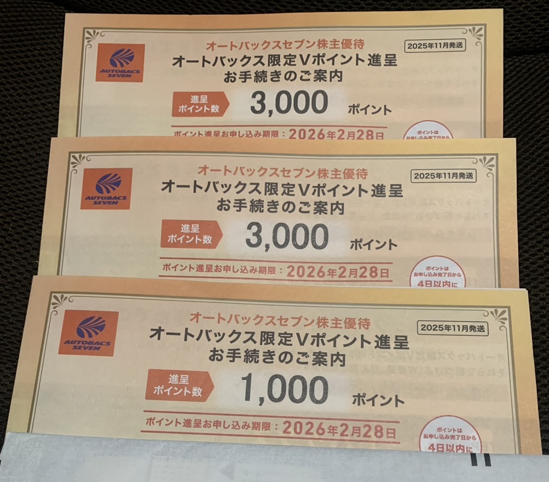 オートバックスグループ各店で利用できる「オートバックス限定Vポイント」(3000×2+1000×1=7000円分)の出品です。