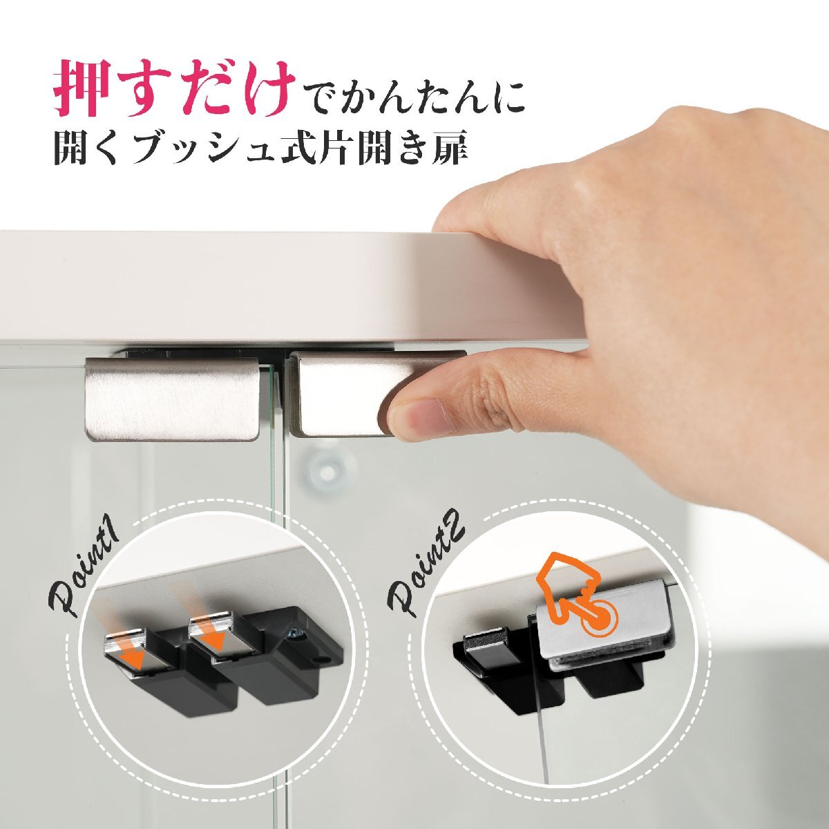 • ガラス扉は片開きなので、片手でも物がとりやすい設計。取っ手の無いマダネットプッシュ式で美しいだけでなく簡単に開閉できます。