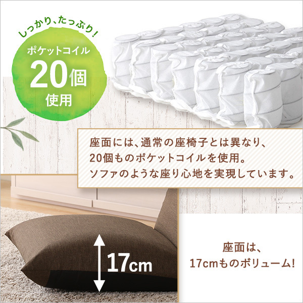 【ポイント】 ふっくらした座面が特徴のリクライニング座椅子です。 座面にはポケットコイルを搭載しているので、柔らかい弾力のある座り心地です。 |