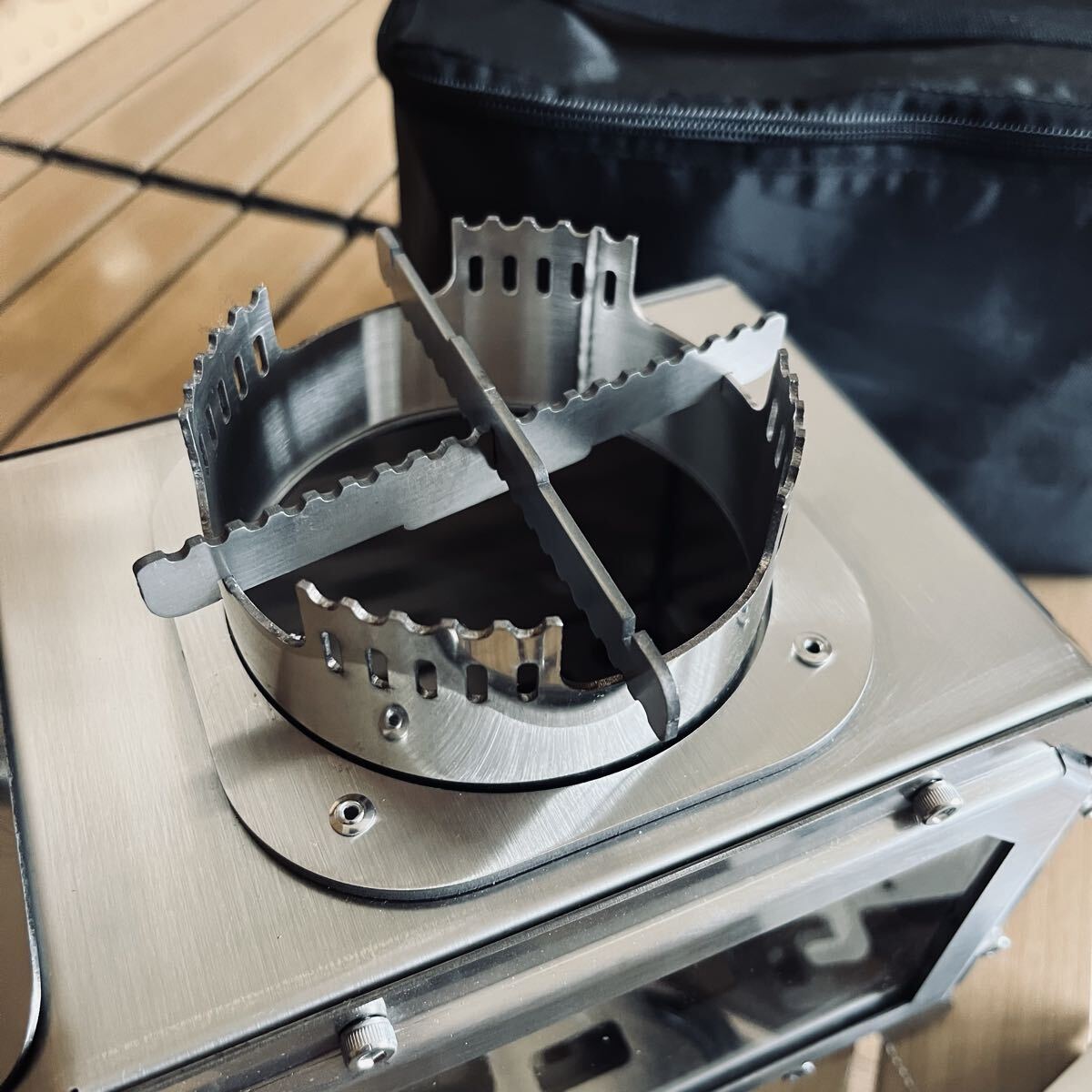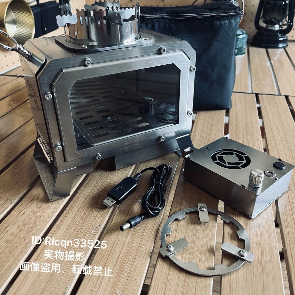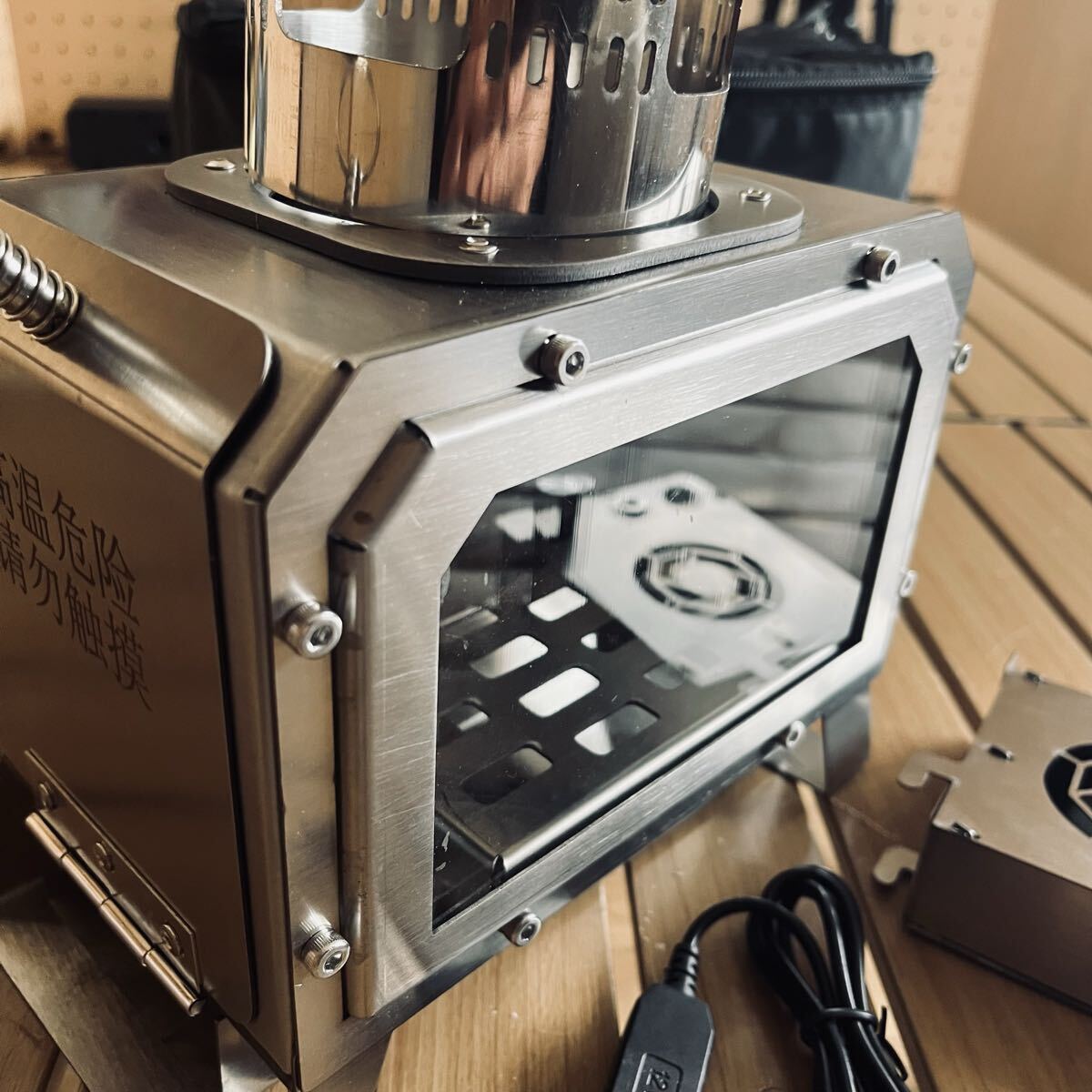 電動送風機搭載 ステンレス製 キャンプ 薪ストーブ 小型テーブル暖炉 ガラス窓 卓上焚火 収納付 USBとtype-c給電 21×21×13cm アウトドア