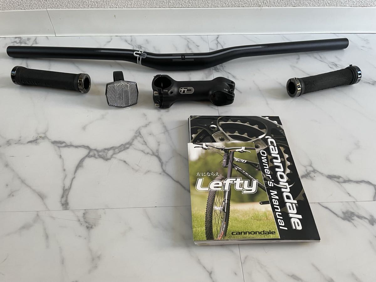 Cannondale製のダウンヒルハンドルバーとグリップ、ステム、ペダル、マニュアルのセット。