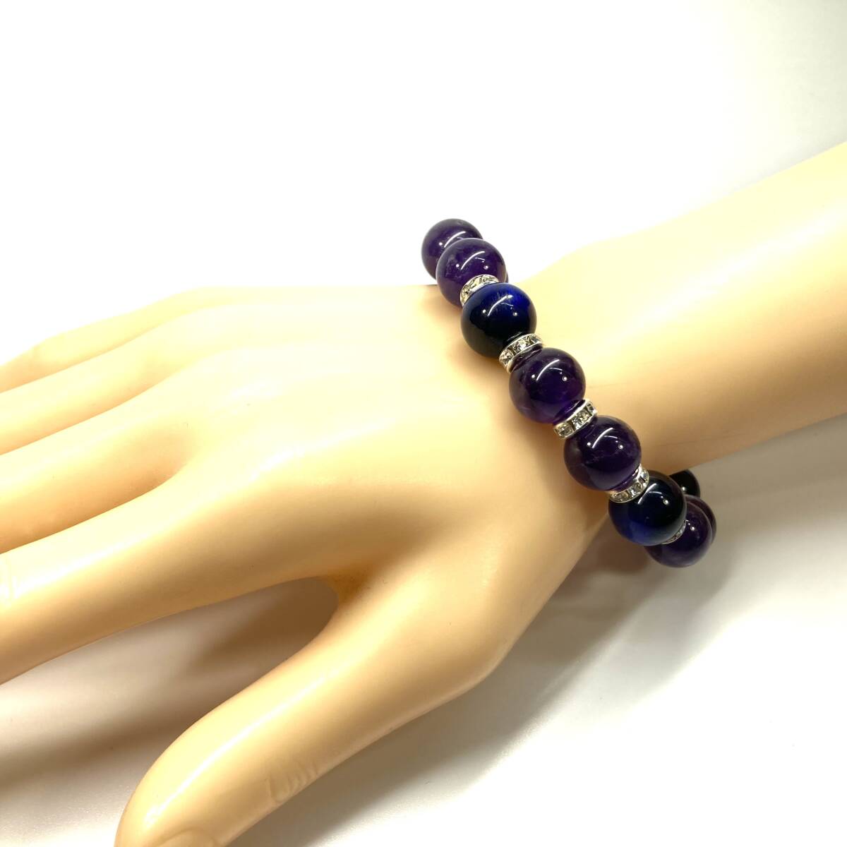 こちらは、ブルータイガーアイとアメジストを組み合わせたパワーストーンブレスレットです。間にはロンデルを挟み高級感あるデザインに仕上げております。石大きさは12mm玉を使用して内周約18cmです。気になる方は是非この機会にどうぞ。