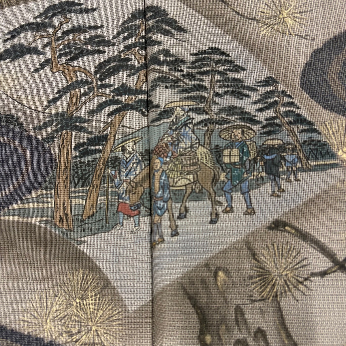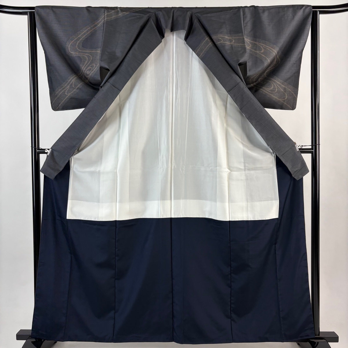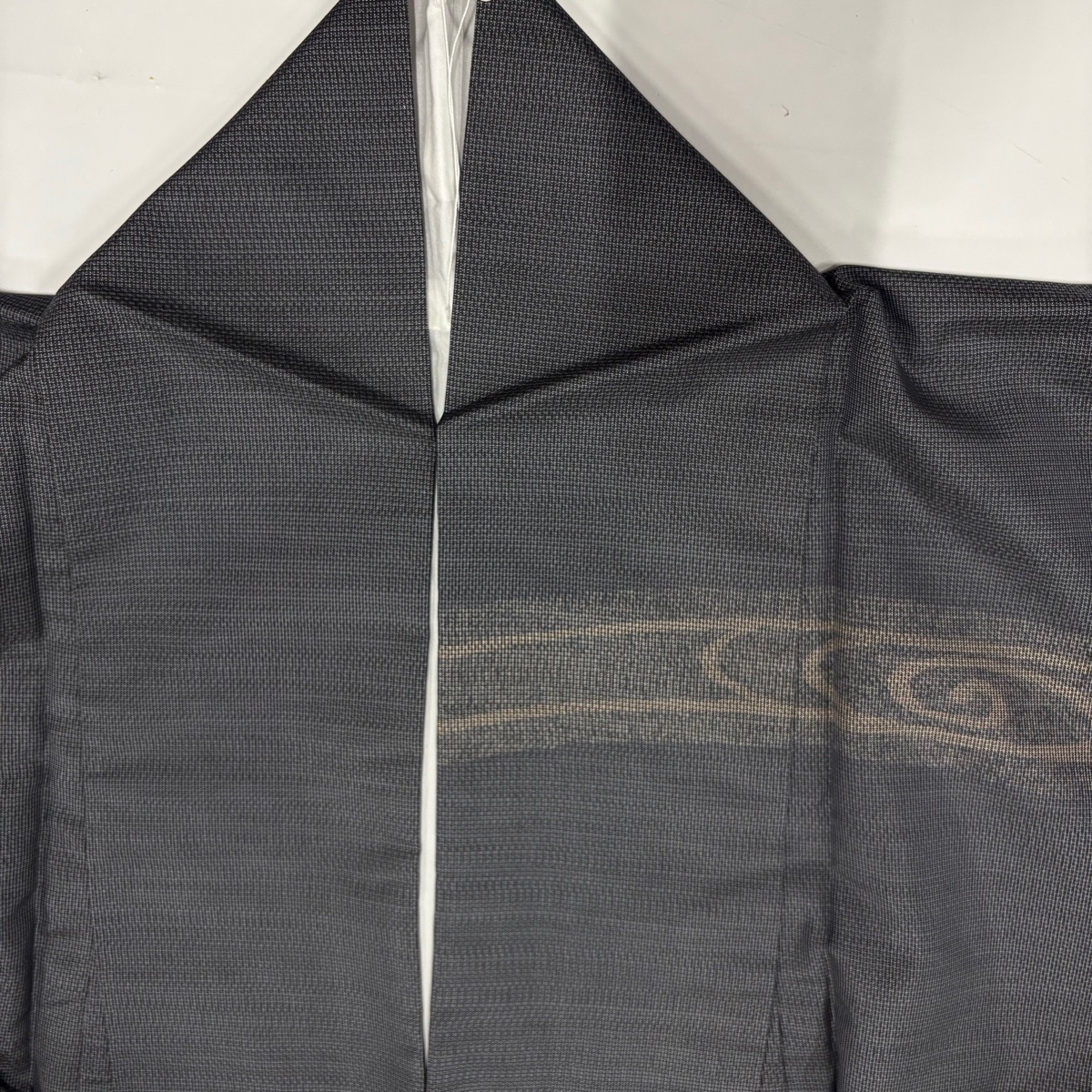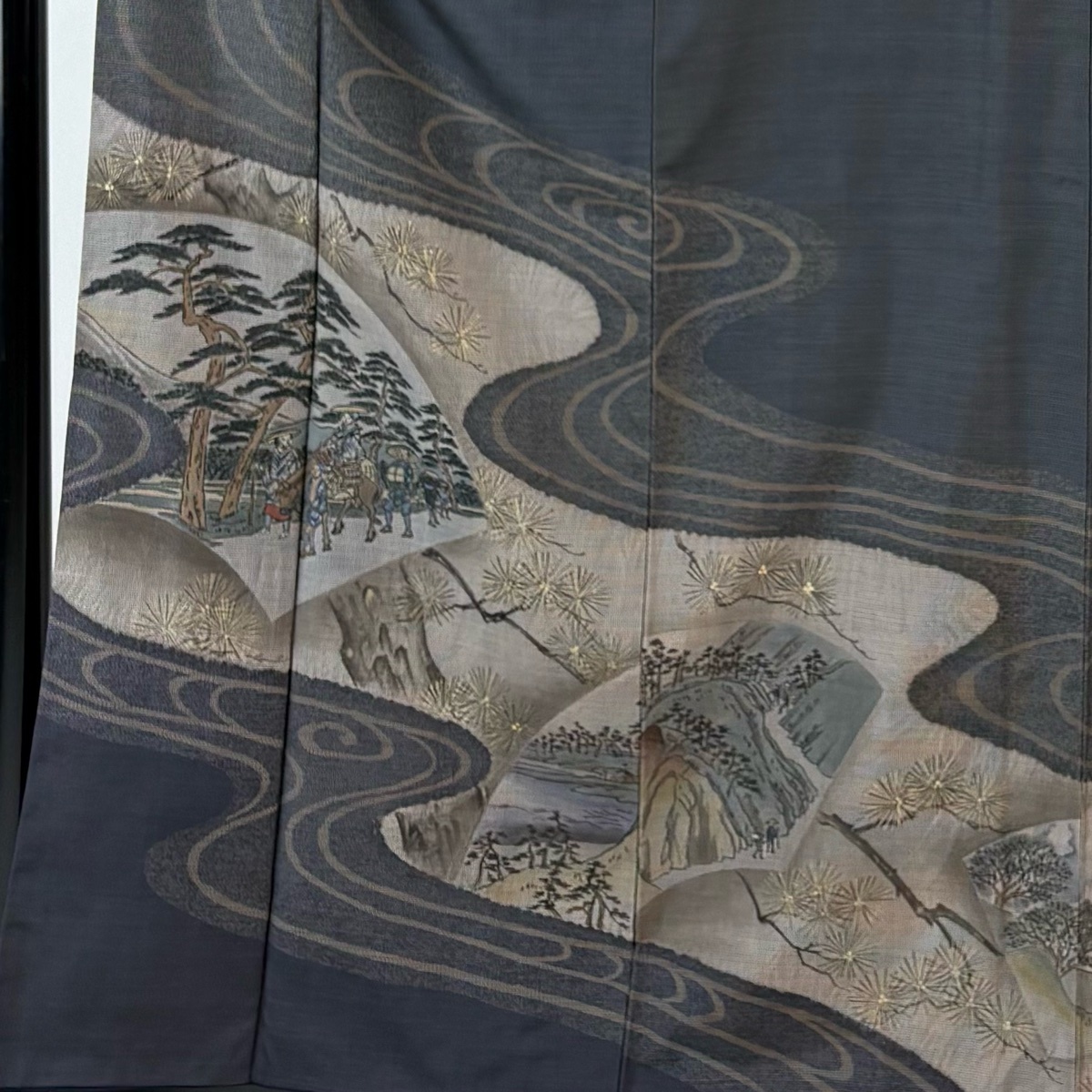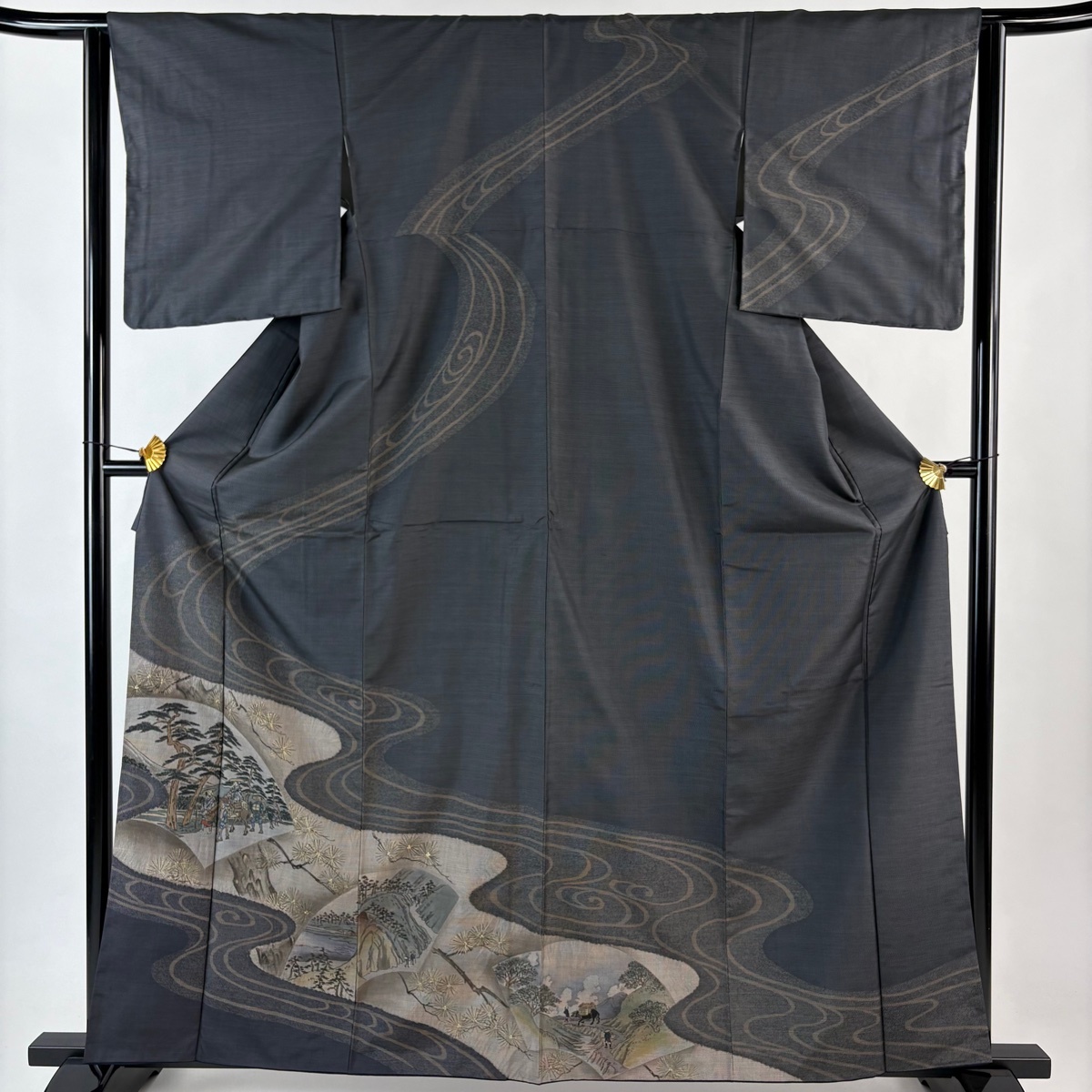 | 訪問着 秀品 紬地 人物 扇面 金彩 黒灰 袷 身丈162.5 裄丈63 S 正絹 【中古】 |