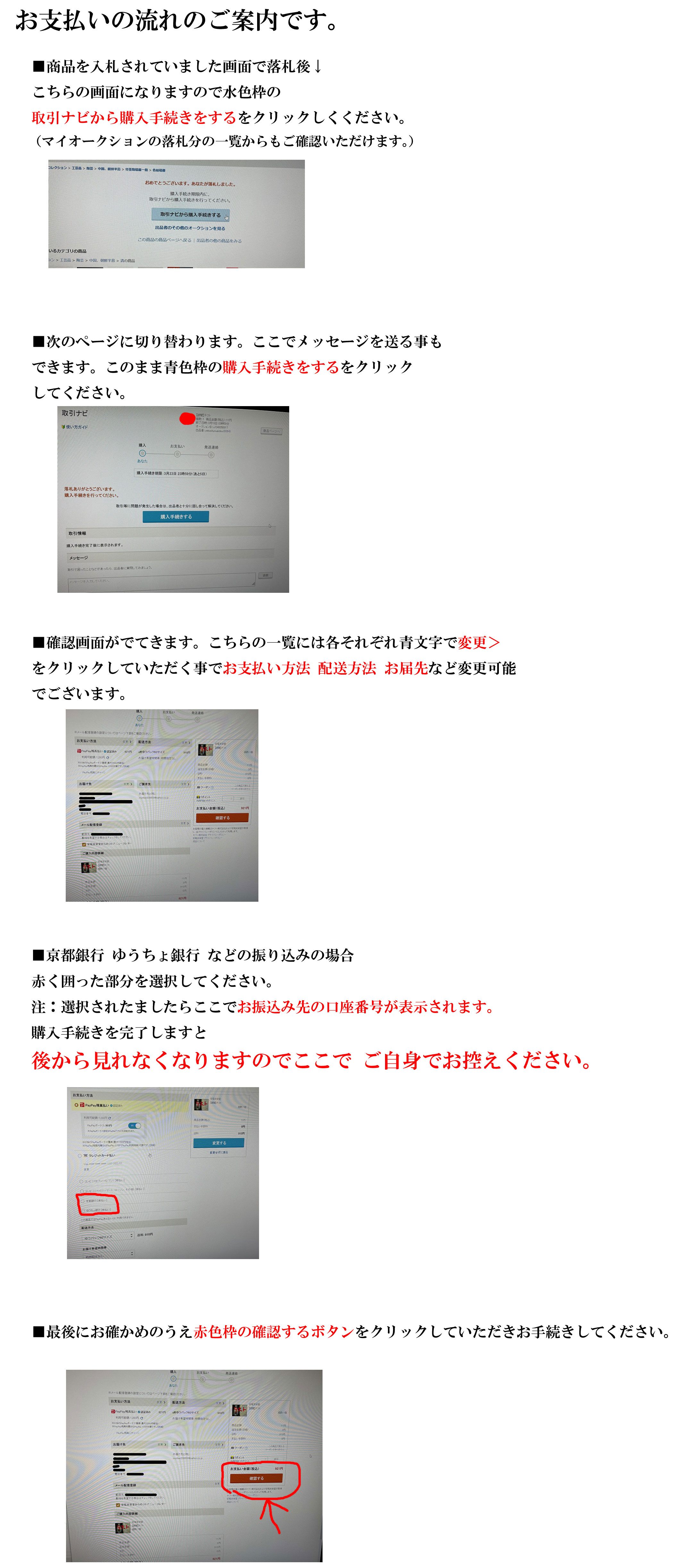 ご落札の際は必ずオーダーフォームにてお取引下さい。 お取引のご案内ですので御入札の前に必ずお読み下さい。 御落札されますとYahoo!から自動で落札の通知メールをお送り致します。 簡単なオーダーフォムを御利用いただくと、スムーズにお取引が進みますので、必ずご利用下さい。 -------------------------------------------------------------------------------- お取引の御質問 安尾京栄堂 075-231-4012 |