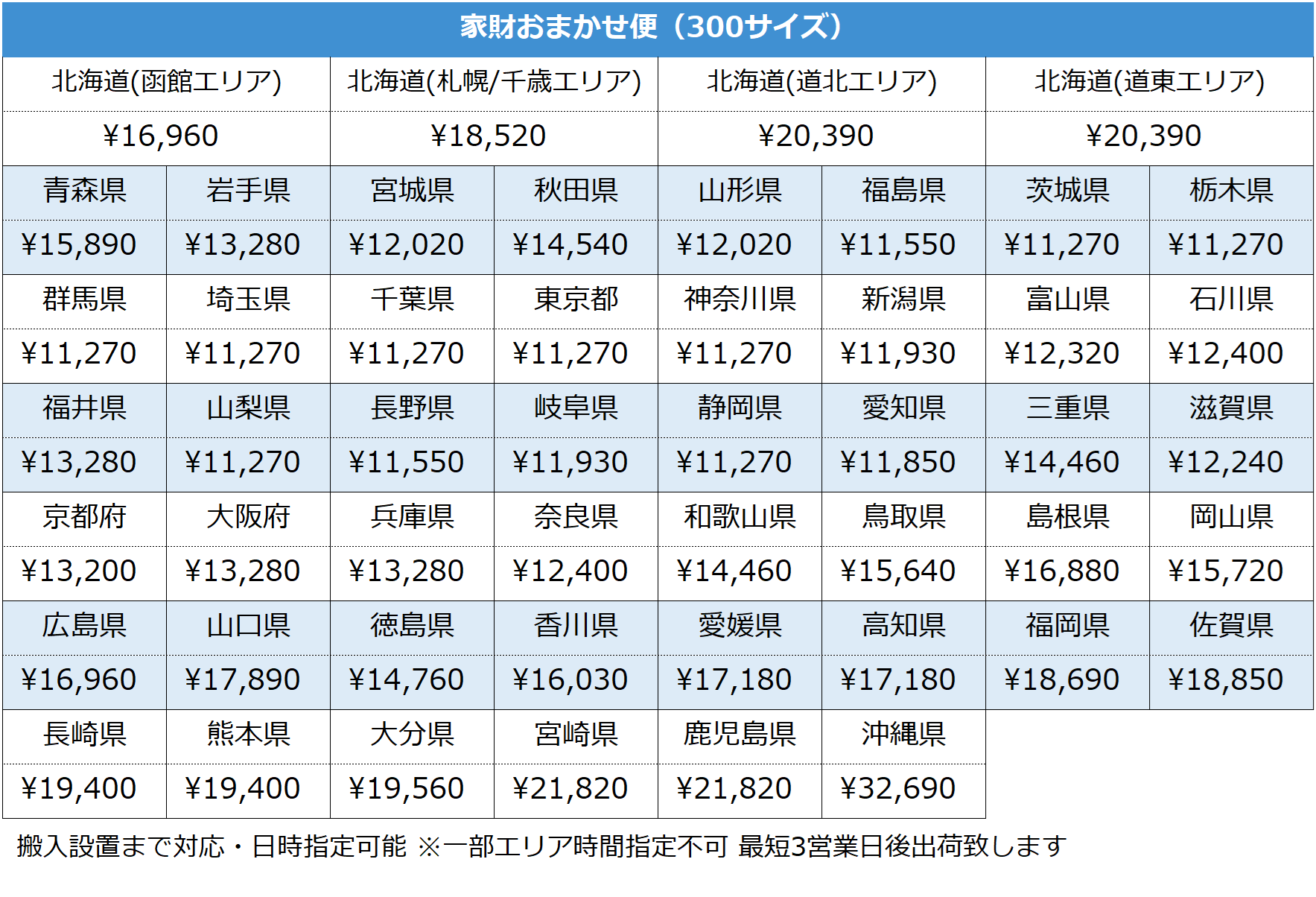 以下配送方法をご案内させて頂きます。 ご落札金額(税込み)+送料の合計をお支払下さい。 ※複数点ご購入の場合、落札数量×都道府県別料金=送料金額となります。 |