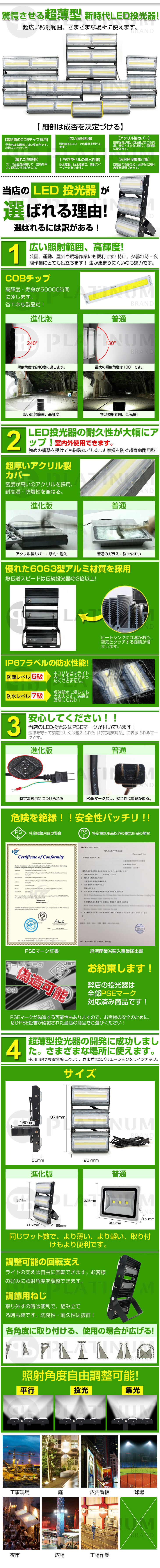 進化版 150W LED投光器 漸く登場! 150Wと省電力で、従来の2000W相当の明るさです! IP67規格の防水仕様!照射角度は240度に達します!公園、運動、屋外や現場作業にも便利です!特に、夕暮れ時夜間作業にとても役立ちます! 虫が集まりにくいの も魅力です。 ◆高品質のCOBチップ採用: 照射角度は240度に達します。高輝度寿命が50000時間に達します。省エネな製品だ! ◆優れた放熱性: 優れた6063型アルミ材質を採用、熱伝道スピードは伝統投光器の2倍以上!ヒートシンクには溝があり、空気とタッチする面積が増大します。 ◆防爆耐震ガラス: 耐圧強度が高いの防爆ガラスを採用。安定丈夫な材質で、長時間に使えます。 ◆IP67ラベルの防水性能: 密封性に優れ、IP67相当の防塵防水性能を実現!場所を選ばず様々な用途の照明に使えます。 ◆照射角度調整可能: 回転支えを使えて、お好みに照射角度を調整できます。 ◆広い使用範囲: トンネル、掲示板、ガソリンスタンド、夜間作業、現場工事、駐車場、公園、運動場にも様々な場所で活躍します!公園、運動、屋外や現場作業にも便利です!特に、夕暮れ時夜間作業にとても役立ちます! 虫が集まりにくいの も魅力です。 【保証】 ◆当商品は12っヶ月保証となります。 ◆お届けから1週間以内にご連絡のあった不良品の保証対応の送料は当方が負担いたします。 ◆保証期間内の不良品ですが、交換のみ対応しております。往復送料はお客様負担となります。在庫がない時だけ返金しますので、ご了承ください。 |