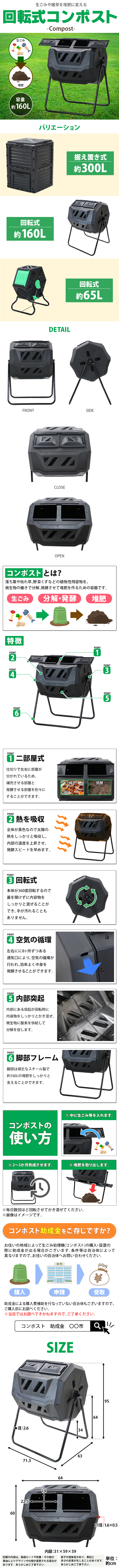 | 商品名 | 送料無料 コンポスト 回転式 160L 回転 二部屋 二層 容器 大容量 家庭用 ブラック 黒 コンポスター 有機肥料 生ごみ処理器 堆肥製造器 処理器 処理機 家庭菜園 園芸 堆肥 肥料 屋外 大型 雑草 生ごみ 生ゴミ 落ち葉 枯れ葉 庭 畑 ガーデニング おしゃれ compostt27 |