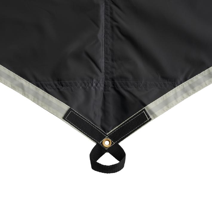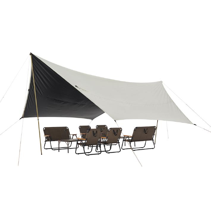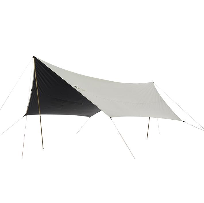 耐風性に優れたヘキサ型で、分厚くて丈夫な難燃性の生地を使用。6ヶ所にグロメットを設けているので、天候に応じてフレキシブルな張り方を楽しめます。