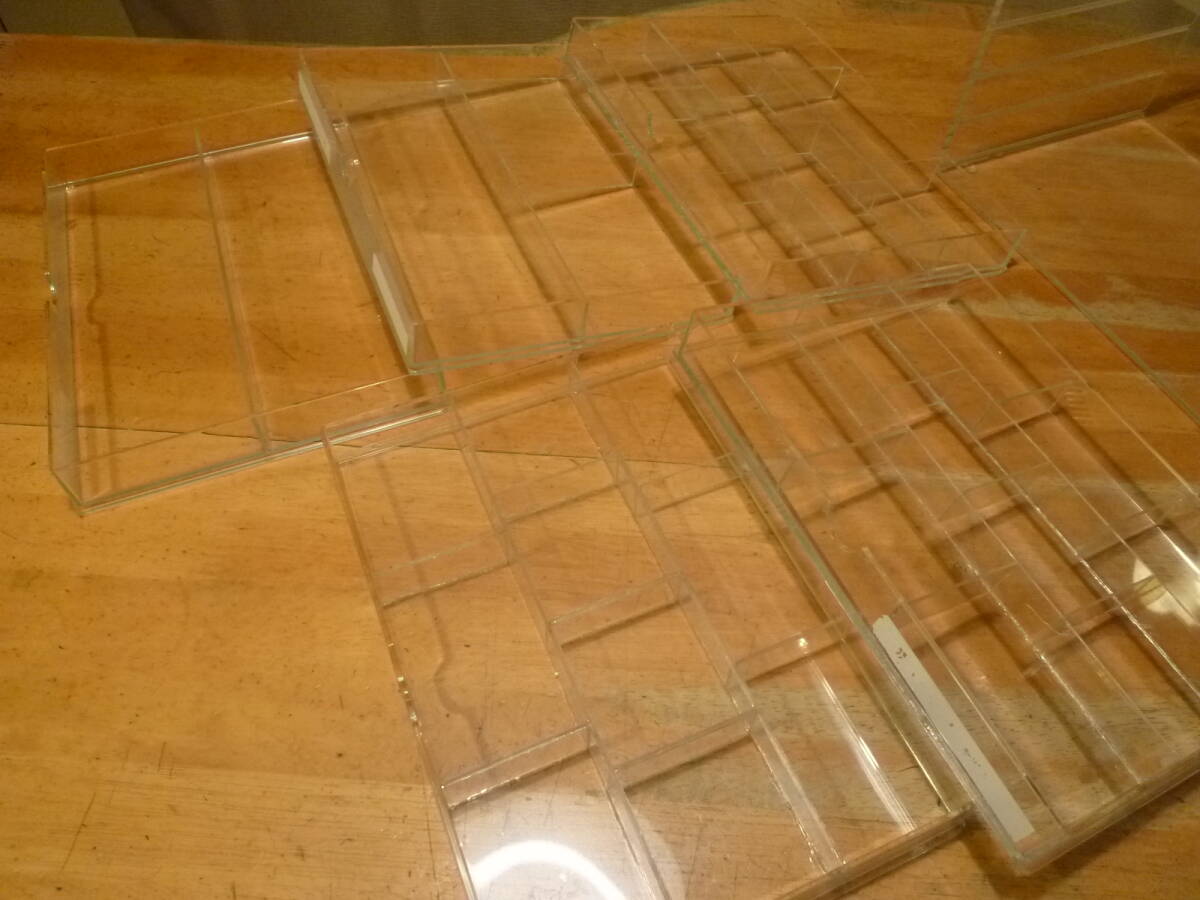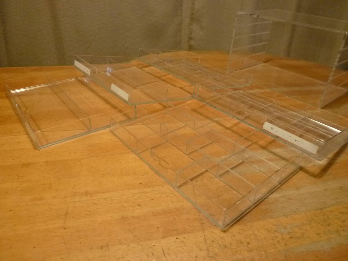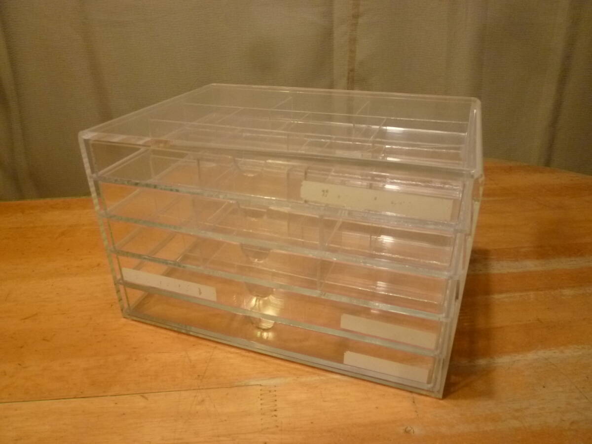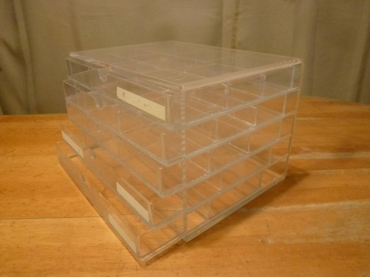 こちらは重量感のあるアクリル製?の小物収納ボックスの様ですが材質等ははっきりしません。深さ2・5cmくらいの5段の引き出しで、中の間仕切りは独自の内容に合わせた様に全て違うものです。