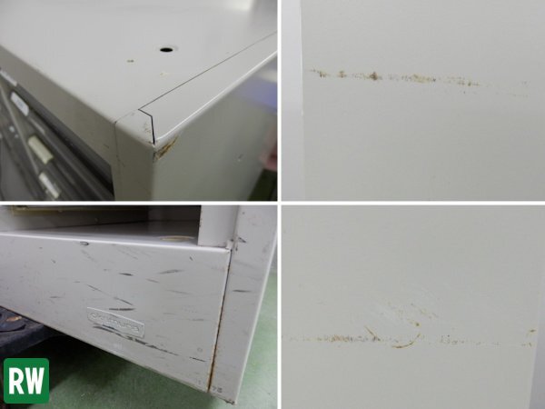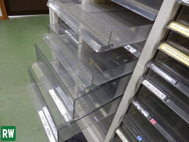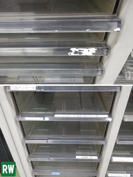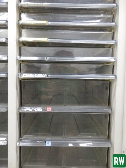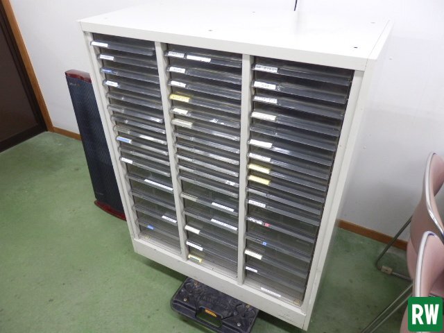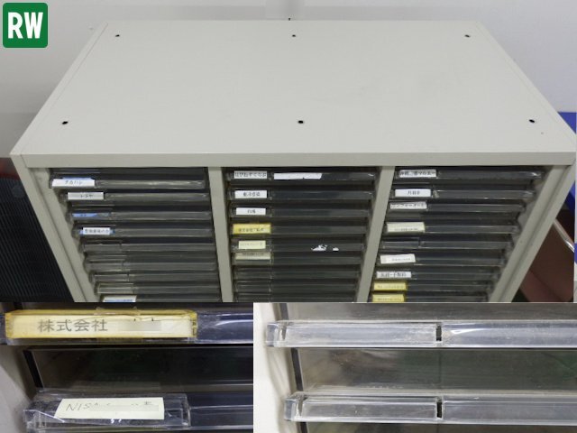 | 状態 | 中古品 引き出しの深さは2種類。浅い方が、11段×3列、深い方が5段×3列。 外側はスチール、引き出しはプラスチック樹脂です。 傷、汚れ、サビ、表面の剥がれ、シール、溶けた輪ゴムのこびり付き等ございます。 引き出しのラベルを入れる部分(ラベルカバー)は、薄いプラスチック樹脂で、 劣化で非常に割れやすくなっています。 割れて補修している箇所、ない箇所等様々です。 ラベルはカバーを外さず、上から貼って使用した方がよさそうです。 カバーを外す場合は、割れることを前提に扱って下さい。 現在付いているラベルは現状のまま発送させて頂きます。 | |||||||||
