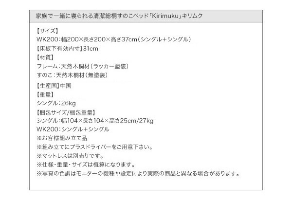 ![]() 総桐すのこベッド Kirimuku キリムク ベッドフレームのみ ワイドK200(S×2) ナチュラル ![]() ※お使いのブラウザ・モニター等の使用状況により色目の見え方が異なる場合がございます。 ◇◆支払詳細◆◇ ※代引き・同梱不可 ◇◆発送詳細◆◇ 納 期:メーカー倉庫直送(入金確認後4営業日内発送) ※商品は玄関渡しになります。 ※北海道・沖縄県へは送料がかかります。ただし、離島は配送不可です。予めご了承ください。 ※離島について:本州・本島などと橋でつながっている場合にも該当致します。 その他一部地域についてお届けができかねる場合があります。 ![]() ■土日祝はお休みさせていただきます。 ■初期不良の場合はお届け後1週間以内に限り返品交換対応可能です。 ■到着後、破損不良等の有無をお確かめ下さい。 ■配送時の梱包のまま交換お願いします。 ■梱包材が無い場合でのお引取りはできませんのでご注意下さい。 ■お客様都合によるイメージ違い、サイズ間違い等の事由では、交換・返品・キャンセル等お受けできません。 ![]() ■在庫状況は日々変動しており、お支払いのタイミングによってはメーカー在庫が欠品となる場合がございます。 ■生産状況や同時注文等により、欠品となる場合もございます。 ■在庫切れの場合はキャンセルとしてお受けいたします。 ■最新の在庫状況のご確認は、質問欄よりお問い合せくださいませ。 ◇◆コメント◆◇ |