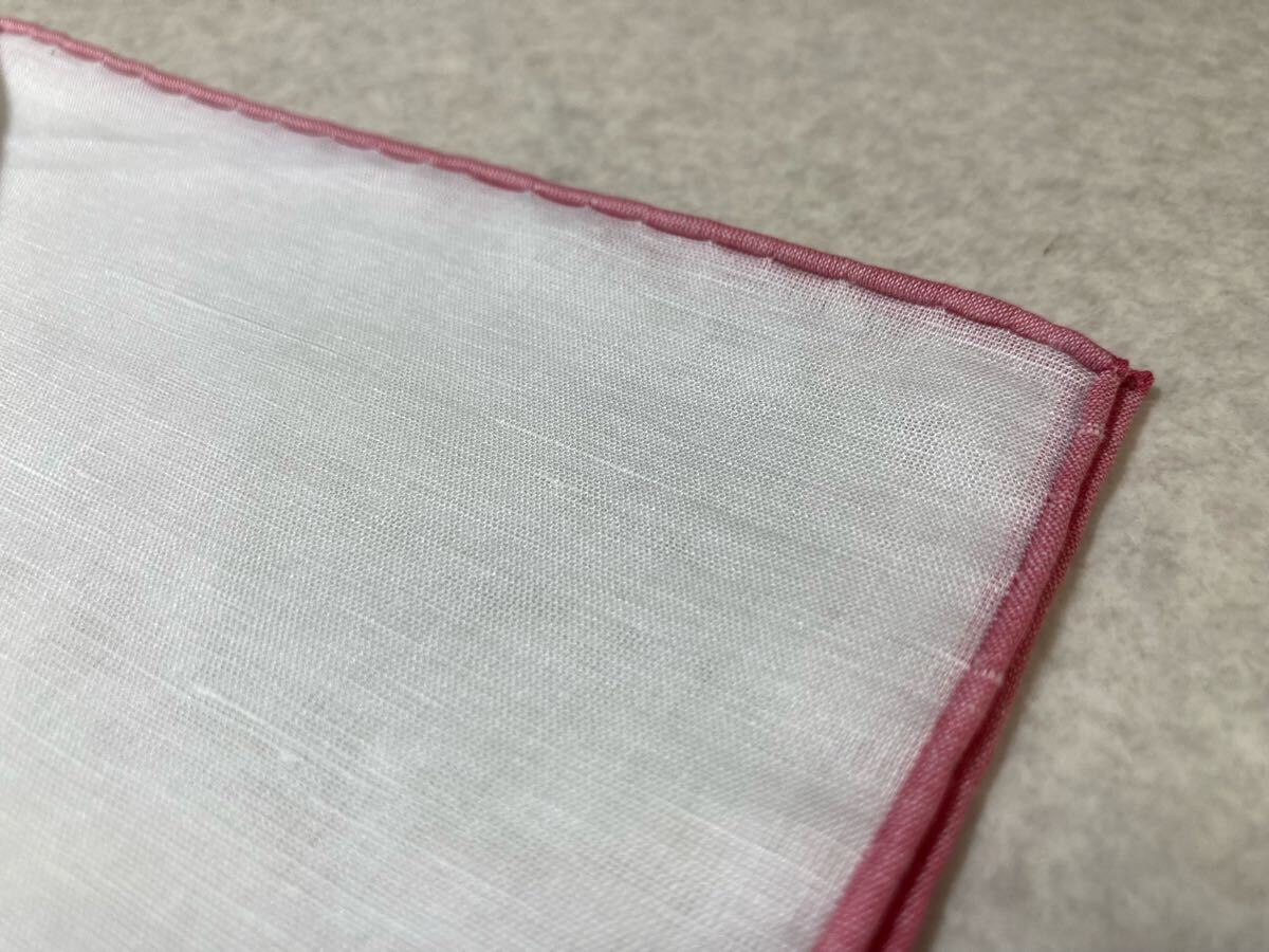 新品 ヘンリープール(英) ポケットチーフ 白にヘムピンク コットンリネン シモノゴダール製の極上品 定価2万円ほど