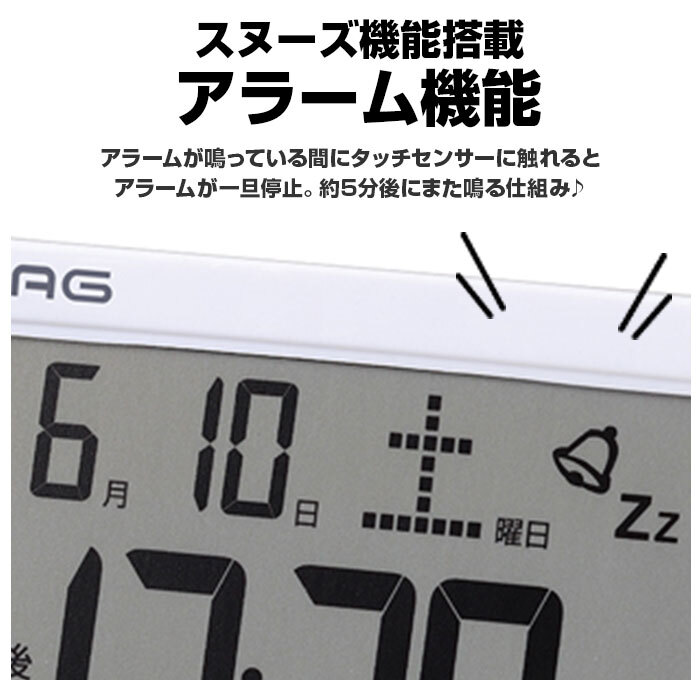 | 商品説明 | ・「タッチセンサー式ライト」搭載の、デジタル目覚まし時計(非電波式) ・本体上部に触れるとタッチセンサーライトが反応!寝起きや消灯後でも、パッと簡単に操作ができる♪ ・「ブルーLEDライト残照機能」搭載!本体上部のタッチセンサーで、ブルーLEDライトが約5秒間点灯。暗いところでも操作がしやすい♪ ・止めてもまた鳴る「スヌーズ機能」!アラームが鳴っている間にタッチセンサーに触れると、アラームが一旦停止。約5分後にまた鳴る仕組み♪ ・「カレンダー表示機能」搭載!忘れがちな曜日まで、見やすく表示♪ ・「温度湿度表示機能」搭載!あると便利な温度計や湿度計♪お出かけ前にチェックすればその日の服装の参考に♪ ・シンプルなカラーとデザインなので、どんなインテリアにもマッチ♪ ・※単4形アルカリ乾電池2本使用。電池は別売りです。 |