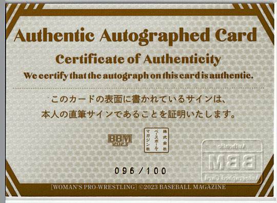 BBM 2023 女子プロレス 荒井優希 直筆サインカード 100枚限定