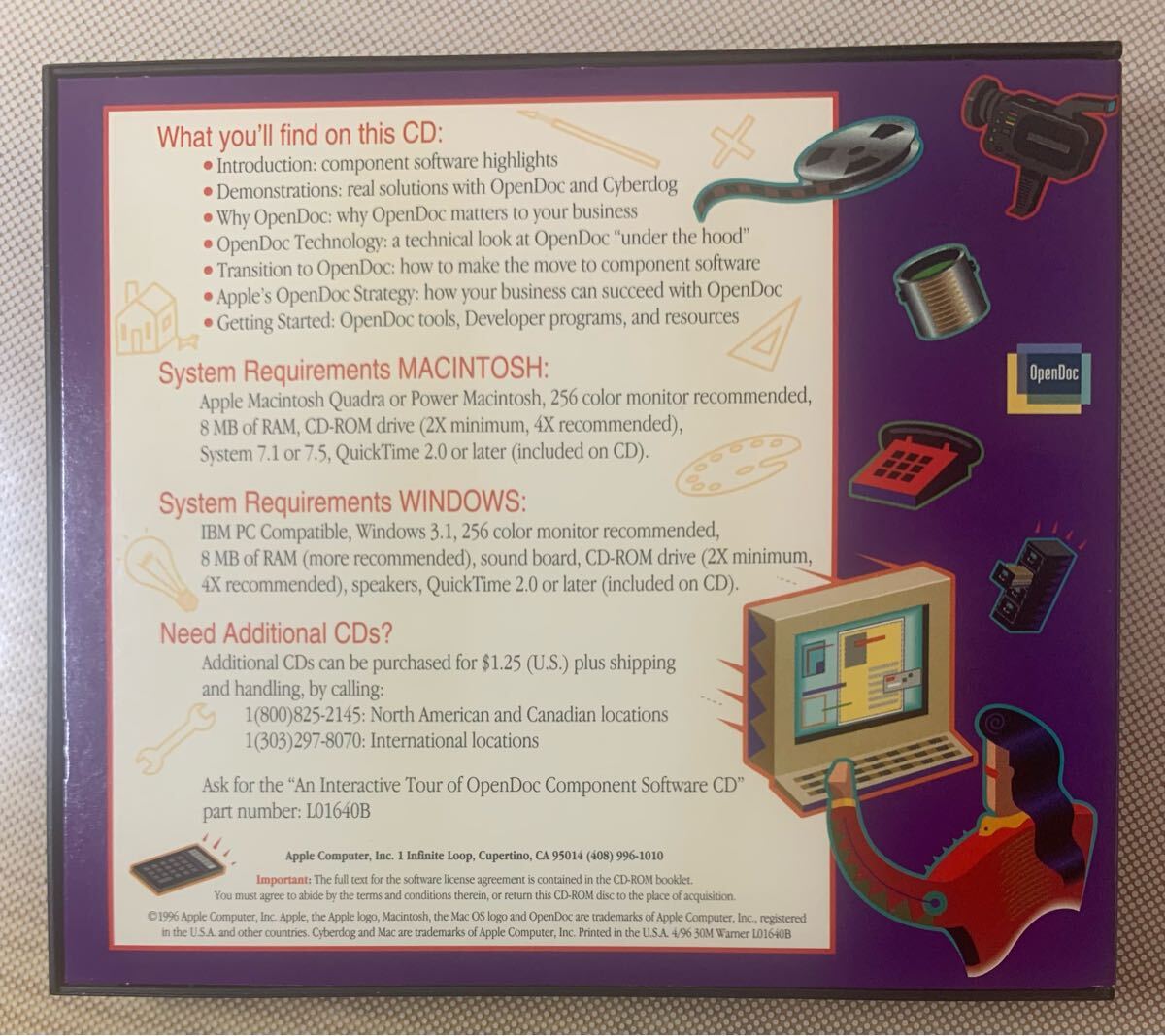 「An Interactive Tour of OpenDoc Component Software CD」(部品番号:L01640B)は、$1.25(米国ドル)と送料・手数料で追加購入可能。北米およびカナダからは1(800)825-2145、国際電話は1(303)297-8070に電話。