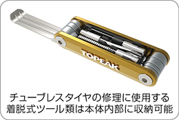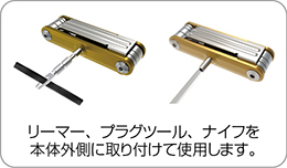 | 商品説明 | ・チューブレスタイヤの修理に使用する 着脱式ツール類と、6サイズの六角レンチ、 T25 トルクスレンチを備えたミニツール。 ・カラー:ゴールド チュビ 11 スペック ・ アルミ合金 鍛造 ボディ、クロム バナジウム ツール ・ 六角レンチ : 2、2.5、3、4、5、6mm ・ トルクスレンチ : T25 ・ 硬化スチール製 タイヤレバー ・ 着脱式ツール付属 (ステンレス製 リーマー / プラグツール、ステンレス製 ナイフ) ・ L76 x W27 x H17mm ・ 83g ※硬化スチール製タイヤレバーはリムを傷つける恐れがありますので、 注意してご使用ください。 |