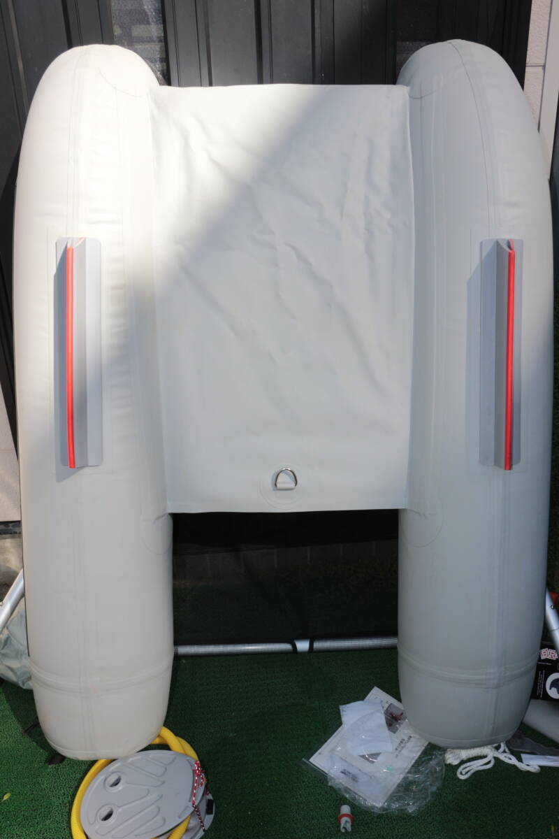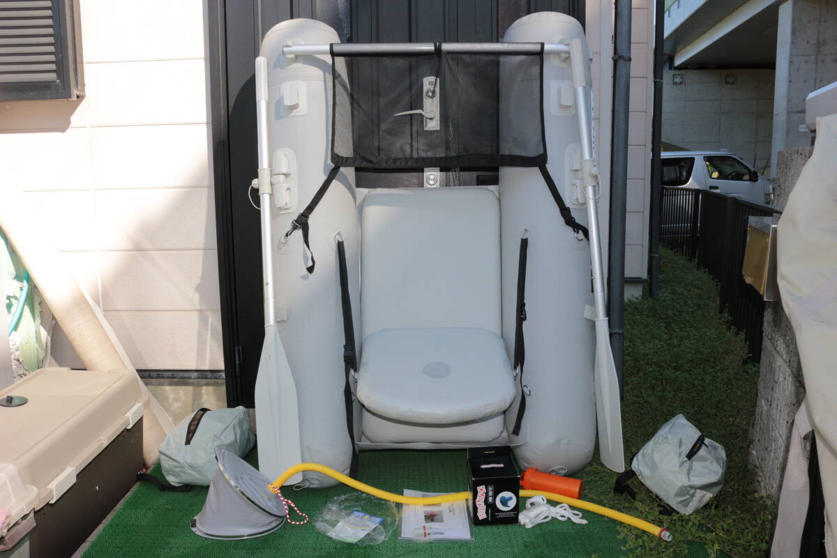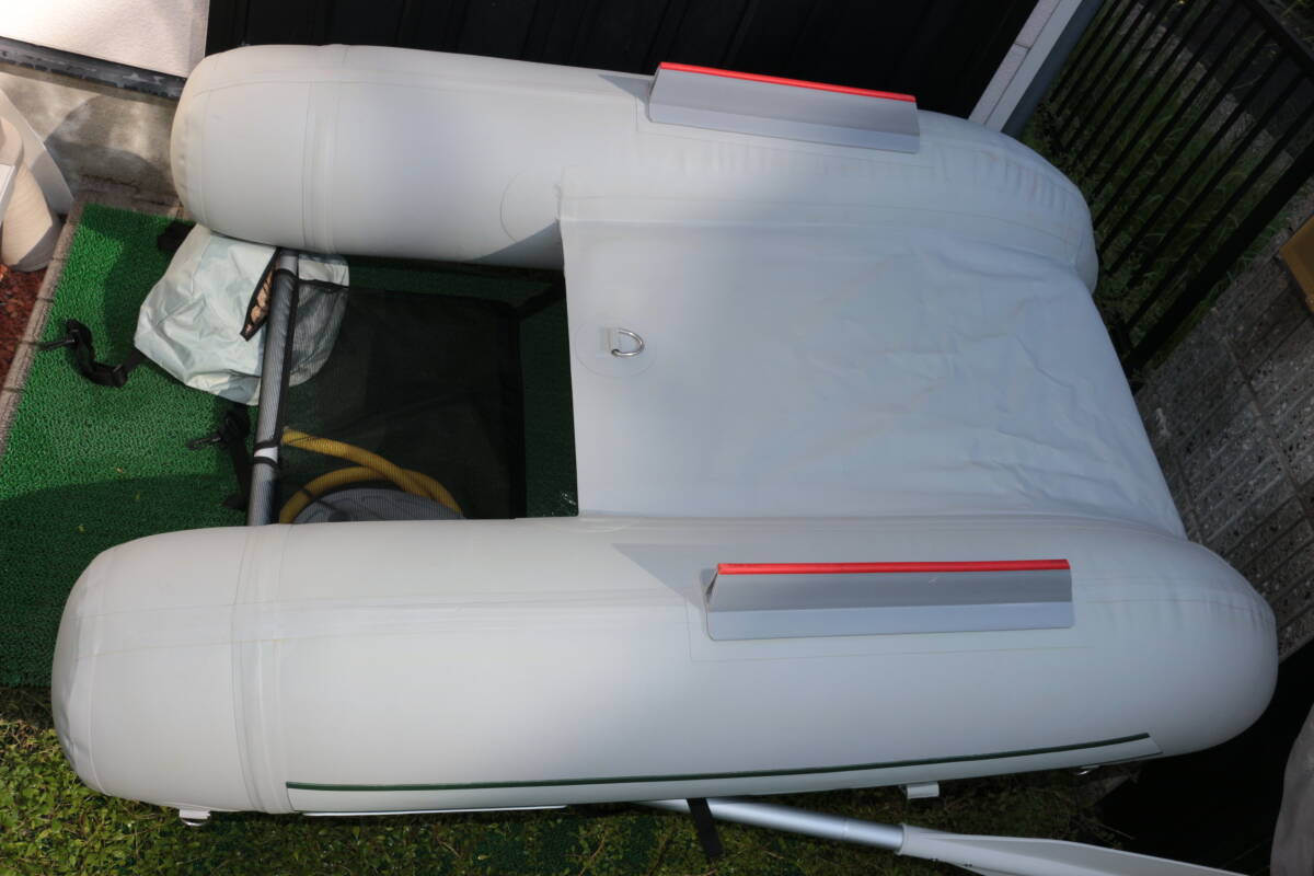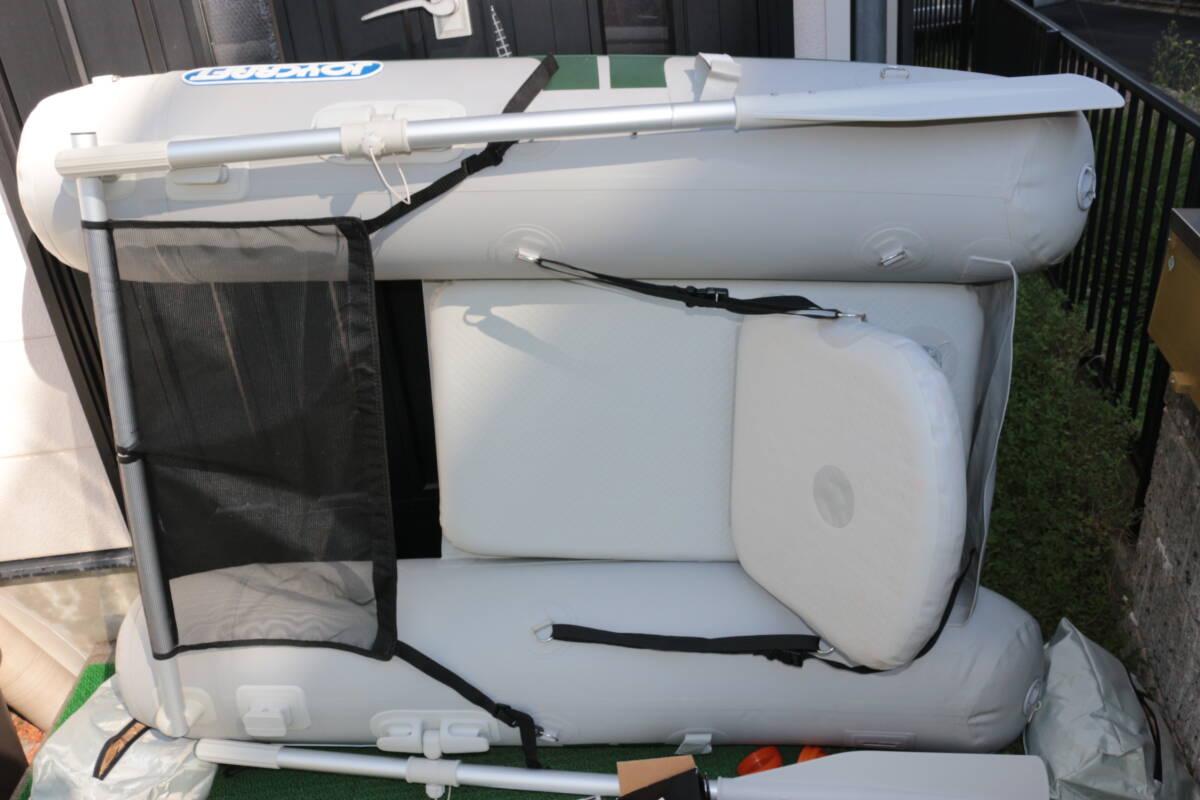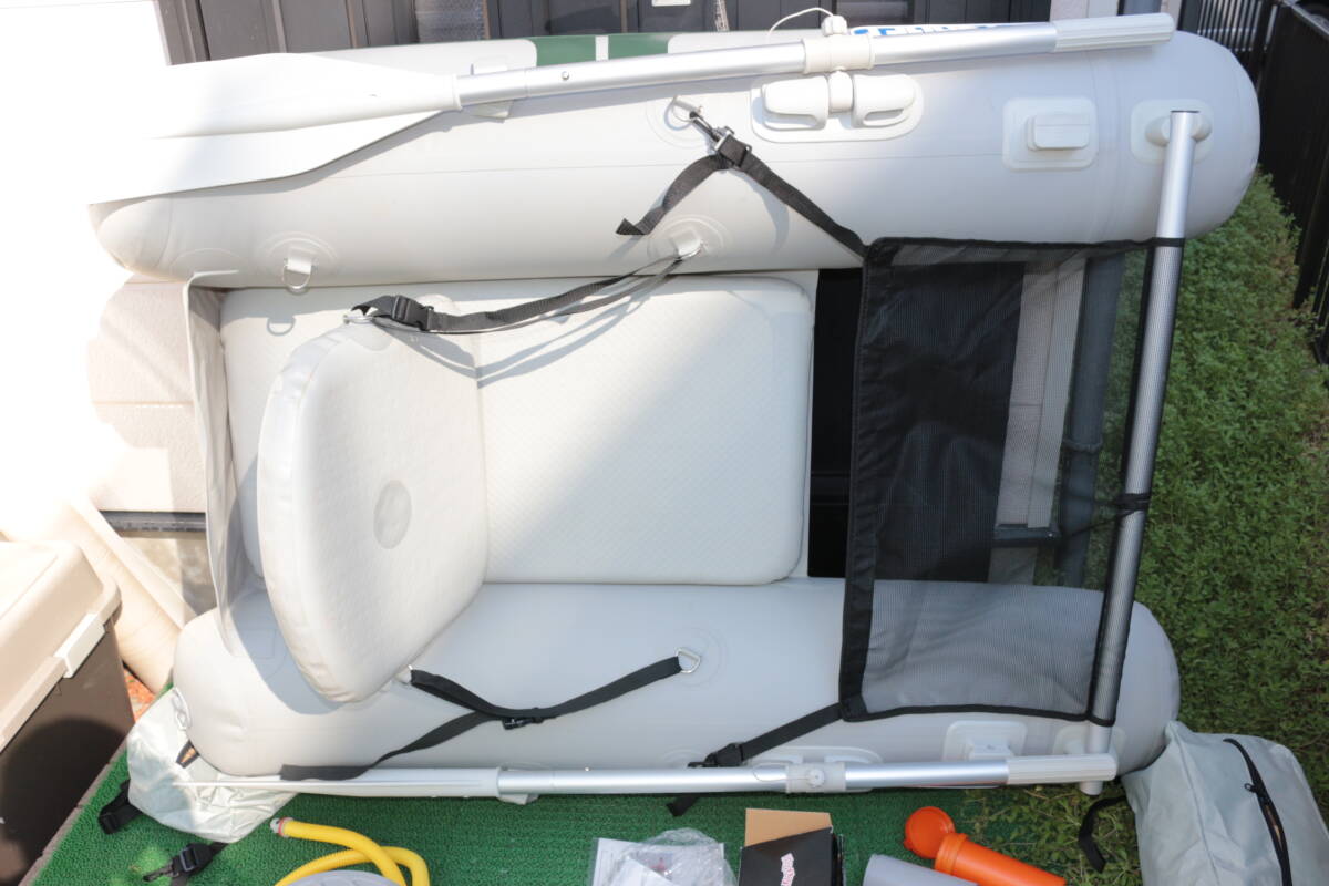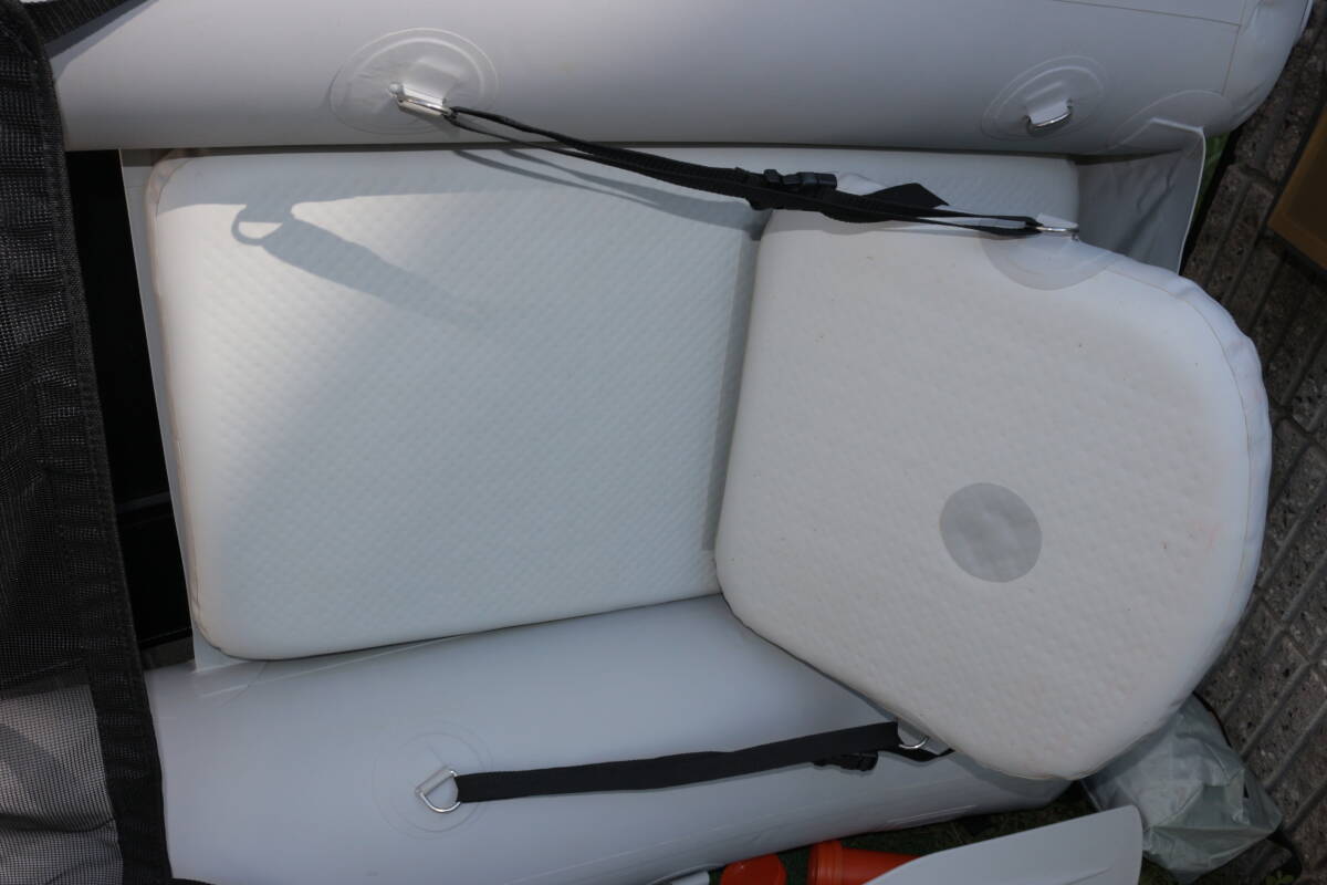 シートも未使用なのできれいなのですが、座面のみ何かが付いたような汚れがあります    他にも詳しい画像をグーグルドライブに上げておりますので、細部の確認はそちらでお願いいたします    基本的には船体未使用なのできれいですし、オールには傷等はないと思います    新品だと61800円で売られていたようですが、ポンプの留め具、キャリーバッグの汚れ、上記アクラサリーバッグのジッパーの不良があります    他には取説や補修キット、12V電源の電動ポンプとオリジナルの外箱もあります    サイズが大きいものですので、それなりに送料がかかりますことをご了承ください