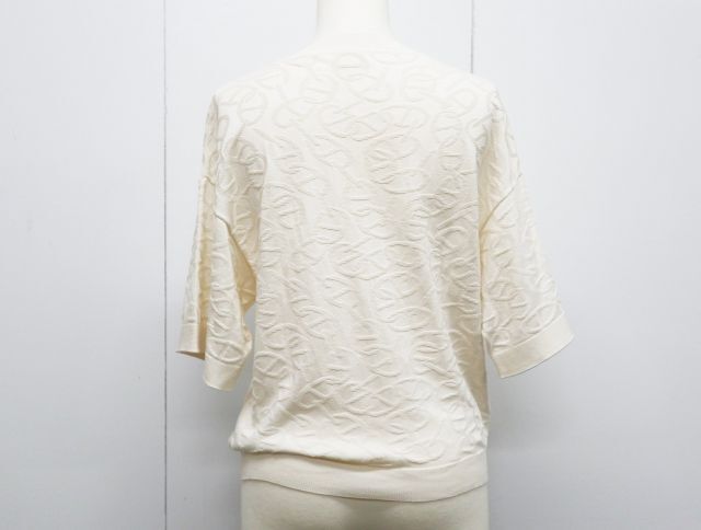 | 商品名 エルメスのシェーヌダンクル、半袖ニット 商品詳細 型番:4E2649DC 素材:シルク、コットン カラー:アイボリー サイズ:36 肩幅:約50cm 身幅:約44cm 袖丈:約22cm 着丈:約51cm 付属品:無し 商品状態 中古のお品です。Bランクです。 |