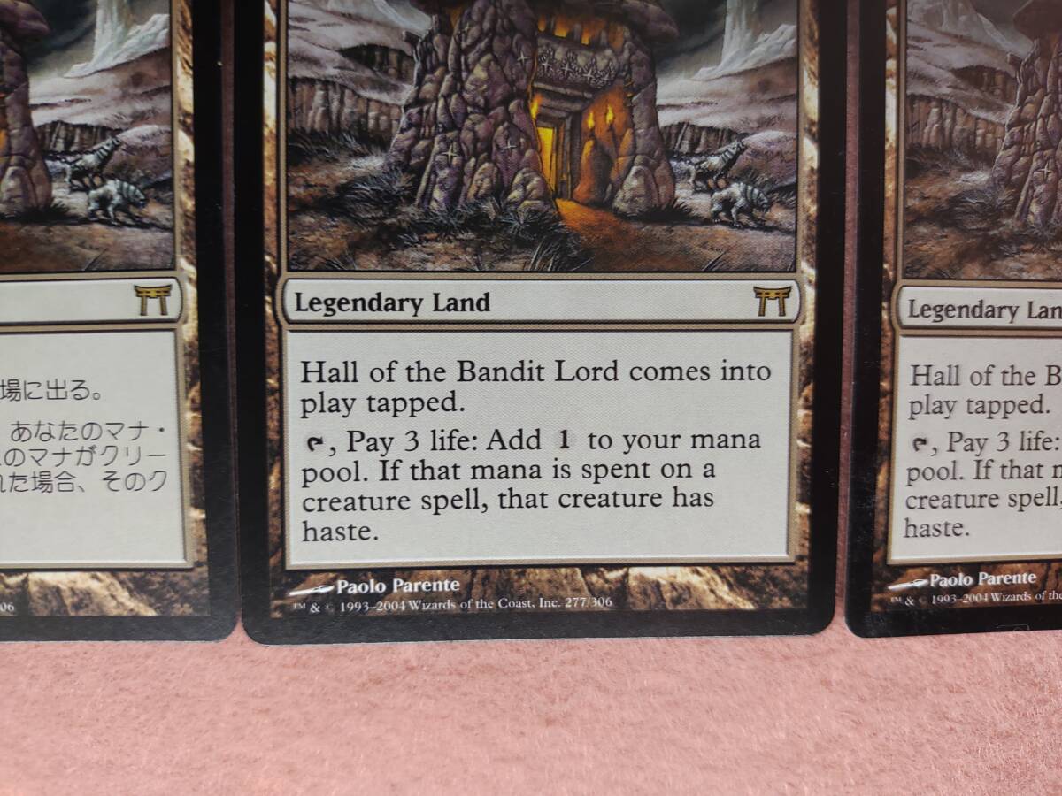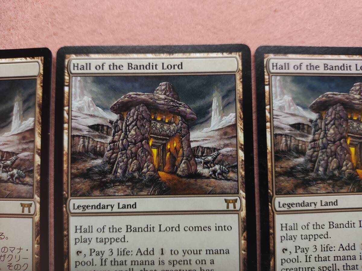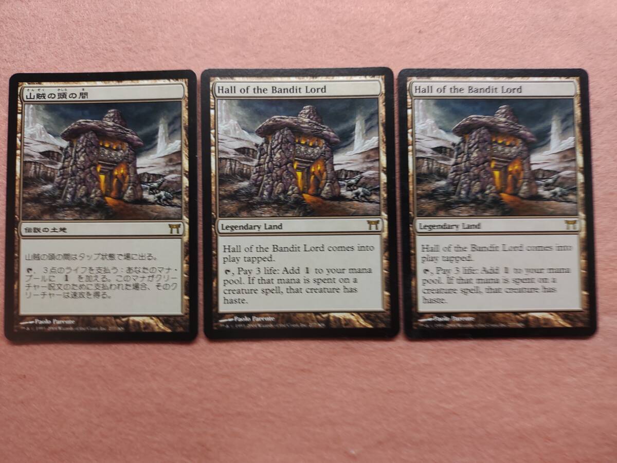 Hall of the Bandit Lord(山賊の頭の間)神河物語、英語版2枚、日本語版1枚、合計3枚の出品です。カード状態の鑑定基準は、3枚ありますので多少の程度の差異はありますが、おおむね良いカード状態で、ニアミントプラス相当(NM+)「わずかに傷やスレあり」になります。