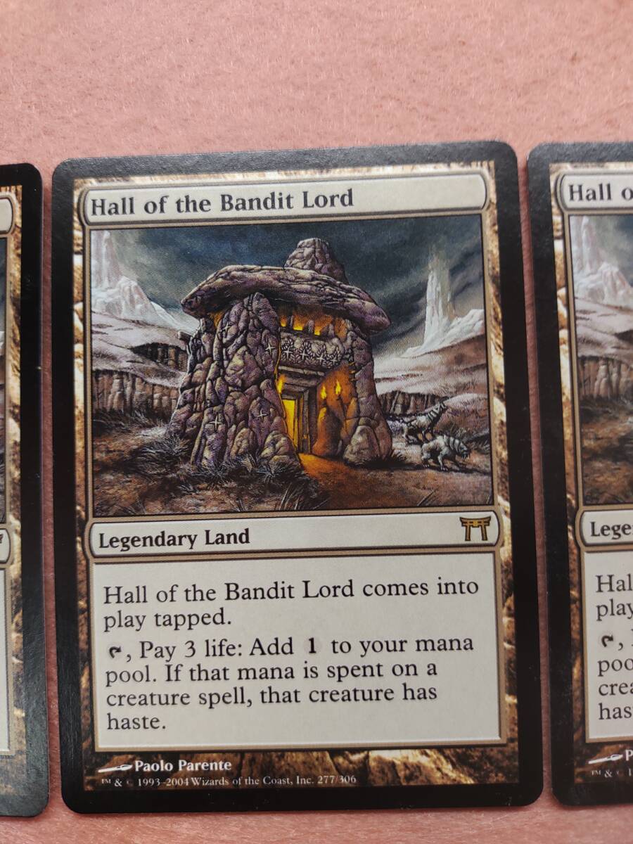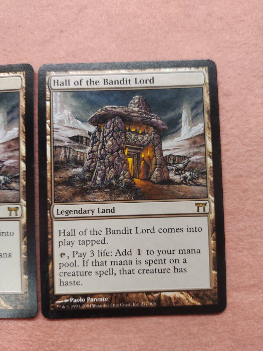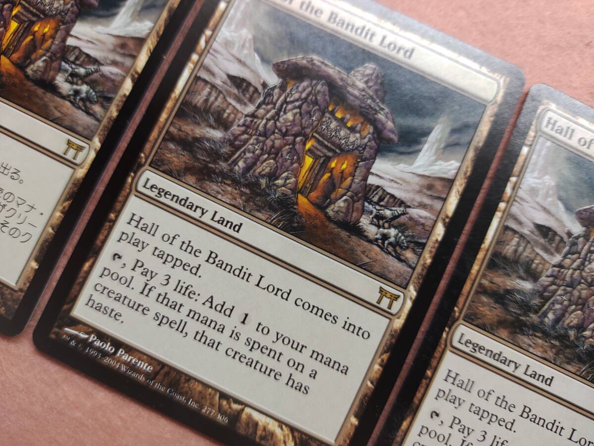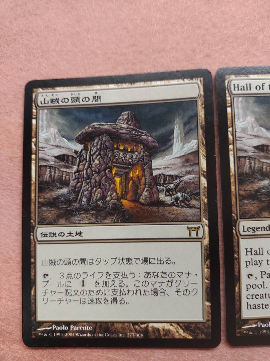 Hall of the Bandit Lord(山賊の頭の間)神河物語、英語版2枚、日本語版1枚、合計3枚の出品です。カード状態の鑑定基準は、3枚ありますので多少の程度の差異はありますが、おおむね良いカード状態で、ニアミントプラス相当(NM+)「わずかに傷やスレあり」になります。
