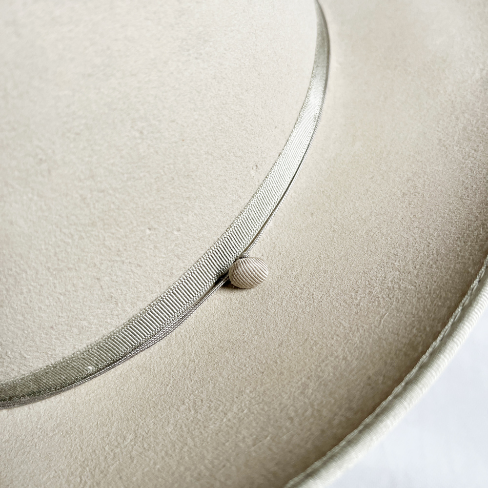 13CMのハイクラウンに、細リボン&パイピングあり仕様で、6.7CMの適度なワイドブリムという人気ディテールが光ります。ウインドキャッチャーボタンコードもしっかり付属。