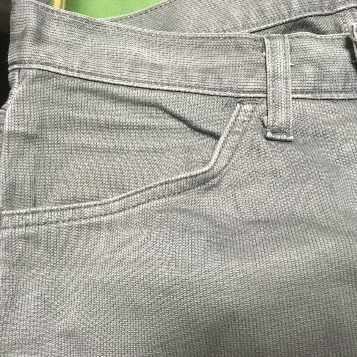ホワイトタブ、内股ダブルステッチ、バックポケット縁シングルステッチで、