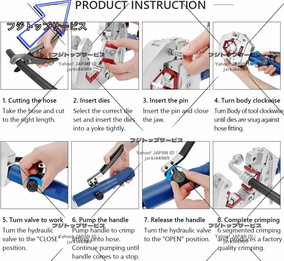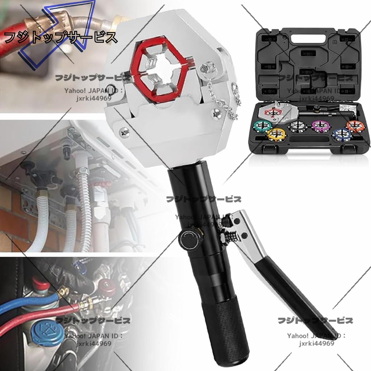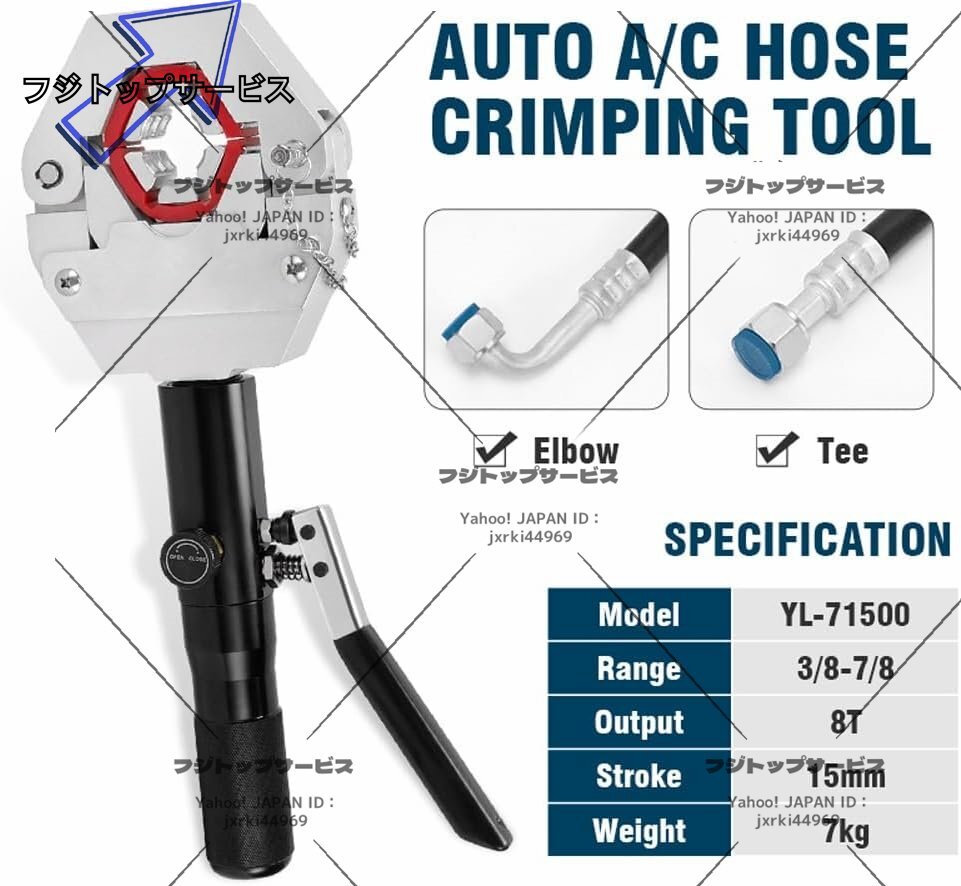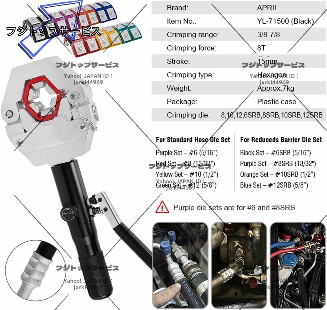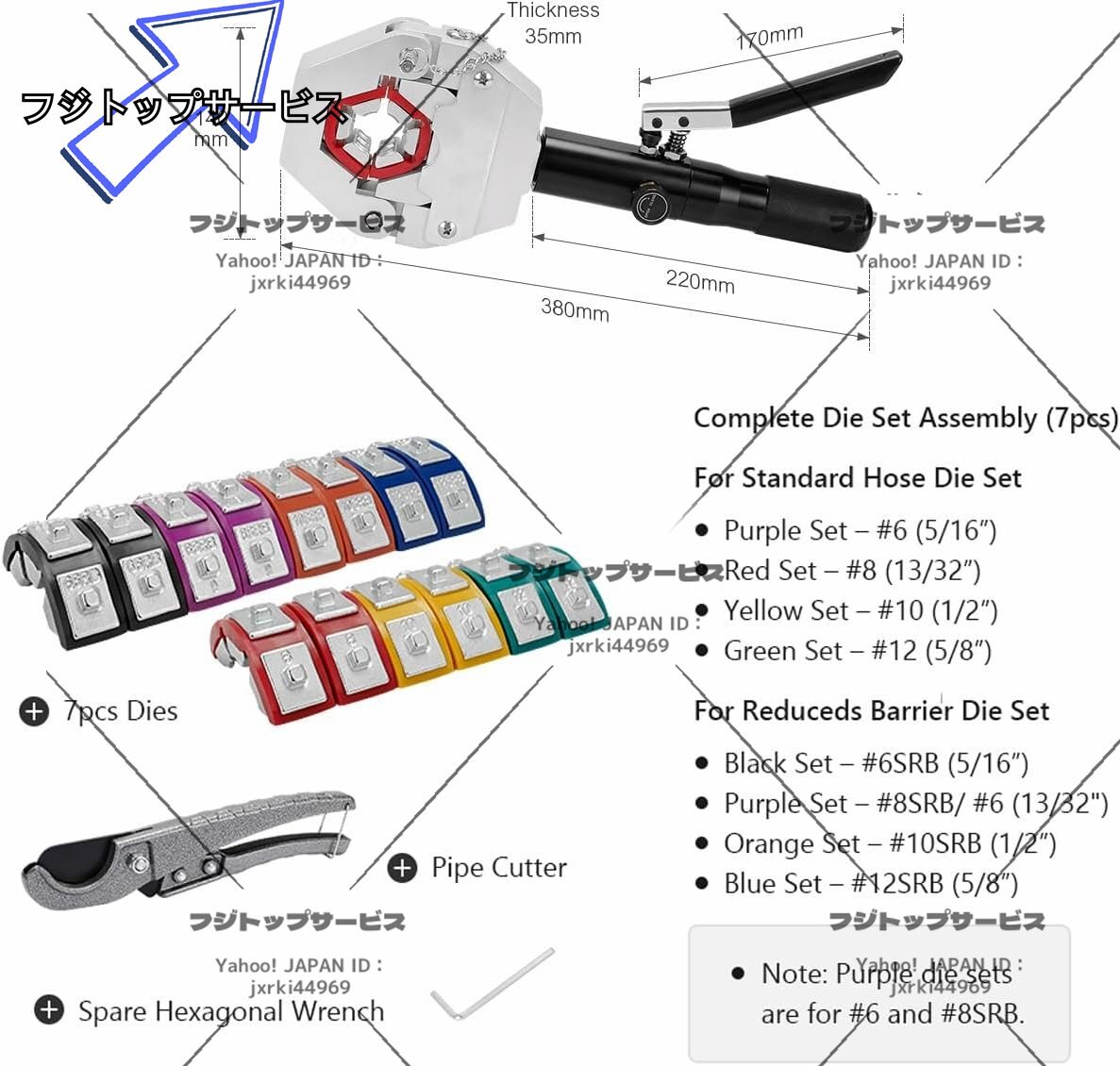 特徴:自動車用ツール キットは、ビーズ付きホース継手とバーブ付きホース継手の両方に使用できます。ホース クリンパ ダイスは、ピンやネジを必要とせず、プレス フィクスチャに素早くカチッとはめ込むことができます。キットはカスタム成形ケースに入っています。このエアコンツールにはキャリングケースが付属しており、ツールキットの持ち運びや保護が容易になります。用途:1.ピンを外してトップヨークを「開きます」。2.正しいダイセットを選択します(説明については裏面を参照してください)3. サイコロをジョークに挿入する4. フィッティングとホースをクリンパに配置し、ヨークを閉じます。5.ピンをしっかりと挿入します。6. ダイスがホース継手に対してぴったりと収まるまで、ツール本体を時計回りに回します。7.油圧バルブを「閉」の位置に回します。8. ポンプのハンドルをホースに圧着接続し、ハンドルが止まるまでポンピングを続けます。9.圧着が完了したら、油圧バルブをOPEN位置に回します。仕様:商品タイプ: 油圧式 A/C ホース クリンパー キット材質: アルミニウム合金ストローク:約15mm圧着範囲: 3ポイントから7ポイント圧着形状:ポイント型六角拘束圧パッケージ内容:ホースクリンパーキット1個。ダイス7組プラスチックケース1個。注記:1. 手作業で計測しているため、1~2mmの誤差が生じる場合があります。2.ディスプレイやその他の理由により、製品の色が若干異なる場合がありますのでご了承ください。