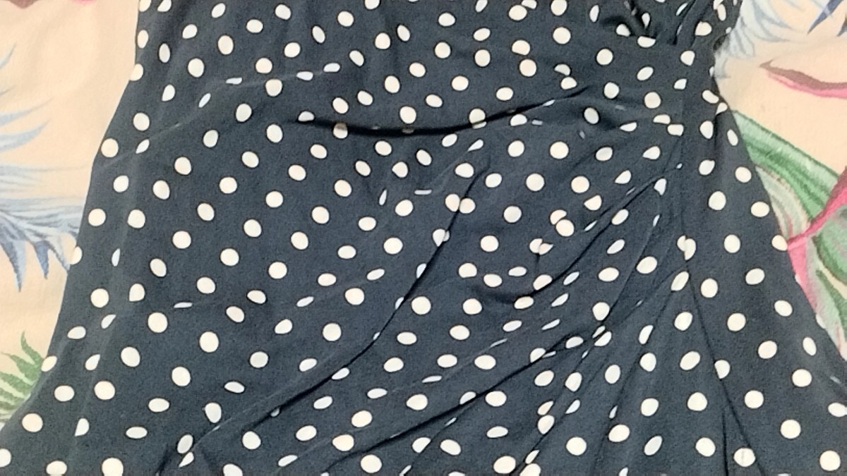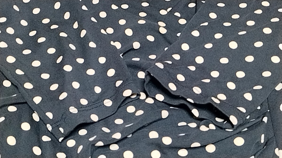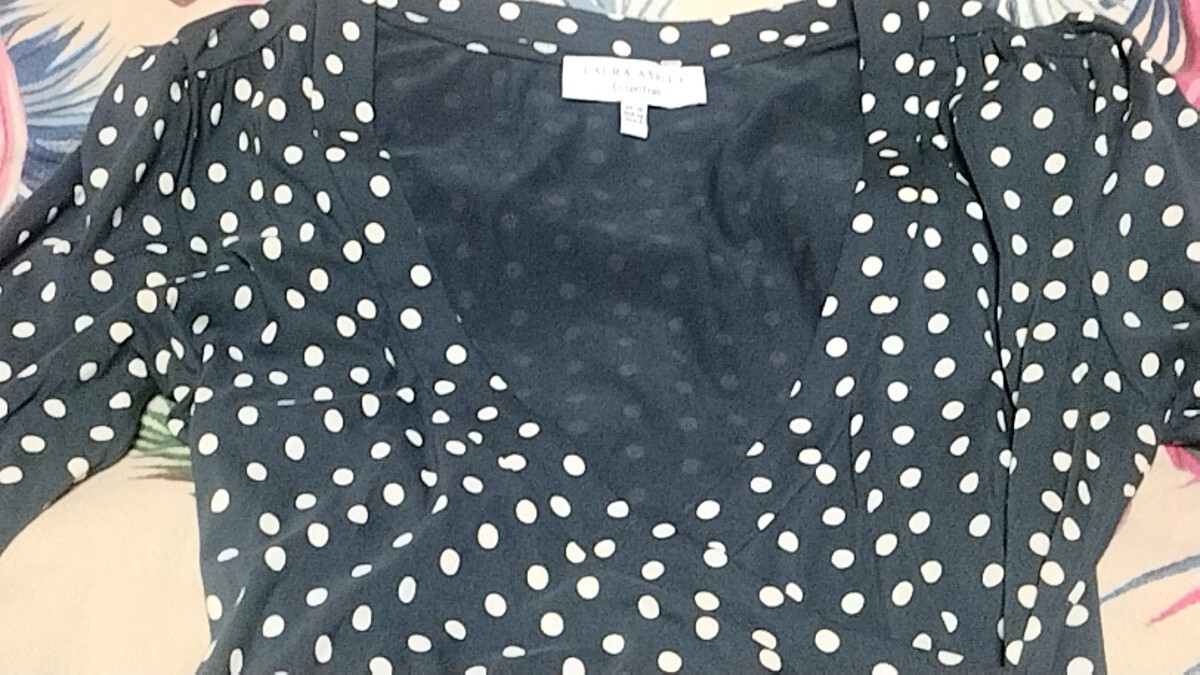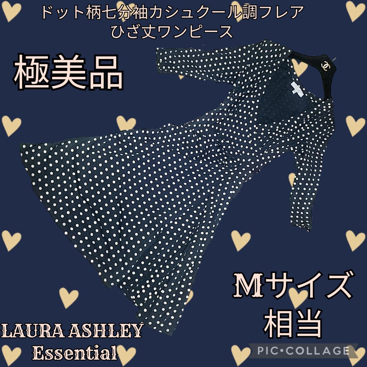LAURA ASHLEY Essential(ローラアシュレイエッセンシャル)の七分袖ドット柄カシュクール調フレアロングワンピースになります。