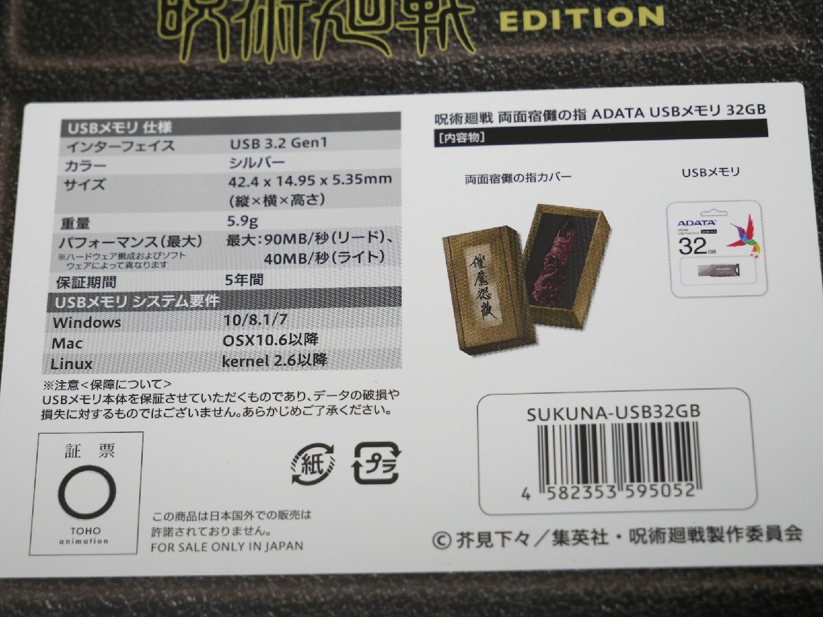 | ◯A-DATA 呪術廻戦コラボ 宿儺の指 USBメモリ 32GB UV350 + 両面宿儺の指フィギュアカバー /SUKUNA-USB32GB ◯未開封・正規品 ====== 商品は写真のもので全てとなります。 初期不良等はメーカーへお問い合わせ下さい。 当方では一切対応ができません。 状態は写真にてご確認の上でご入札をお願いします。 外箱へもごだわりのある方、神経質な方のご入札はご遠慮ください。 | |||