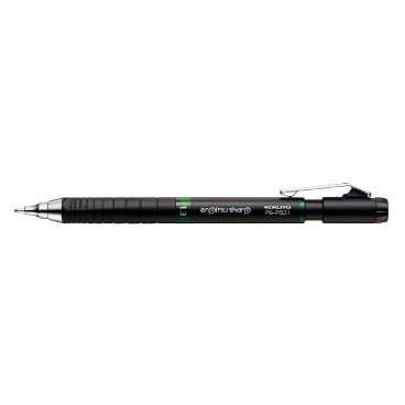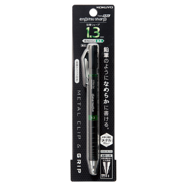 ●上質なデザイン、大人の太芯シャープペンシル。落ち着いたダークトーンのボディに金属クリップの光沢が際立つ。