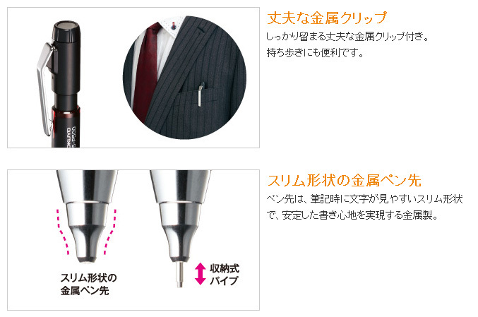 ●ペン先が細くなっているので、筆記時に文字が見やすいスリム形状です。金属製なので、安定してしっかり書くことができます。また、先端のパイプは安心の収納式です。