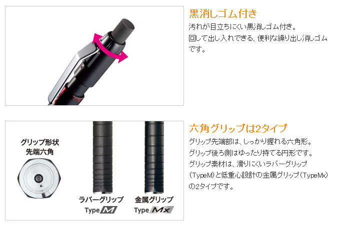 ●黒消しゴム付/汚れが目立ちにくい黒消しゴム付きです。便利な繰り出し式です。※本製品には2B芯が2本入っています。