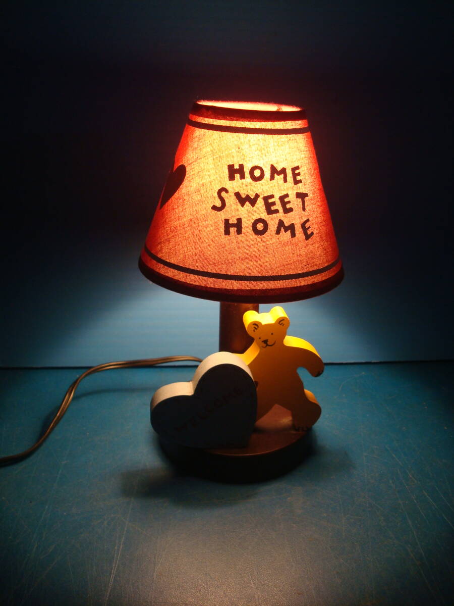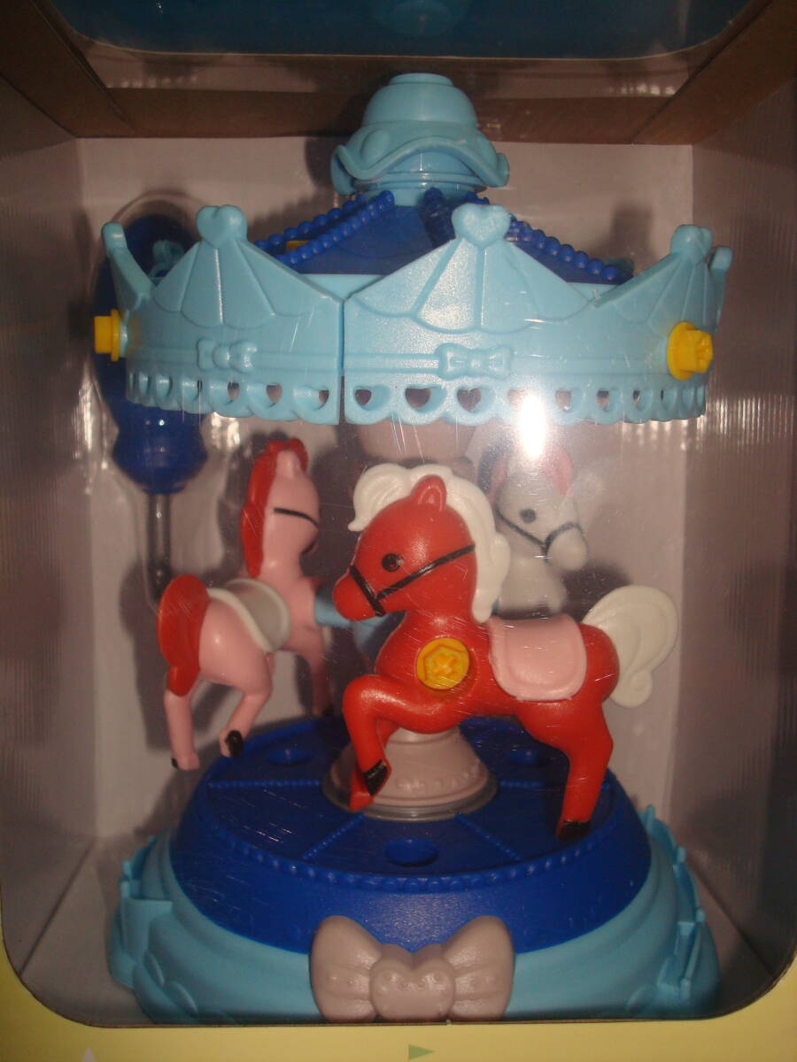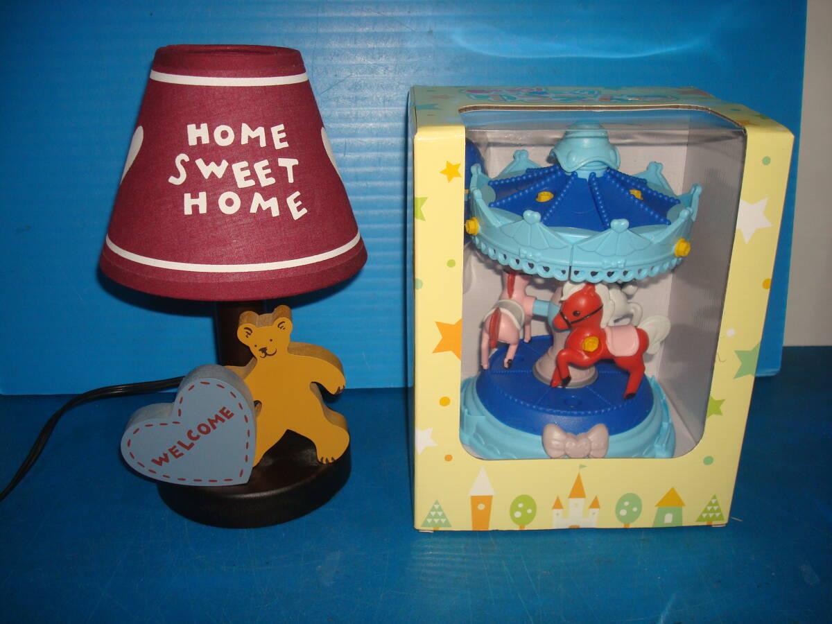 ①卓上ライト(Luky-Farm)と②メリーゴーランドになります。破損等御座いません。①コード中間スイッチ、コード長;1.6m。H;22cmx笠径;12cm。②おもちゃ;頭のボッチを上下するとメリーゴーランドが廻ります。