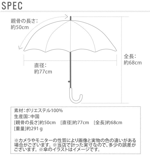 | サイズ | [親骨の長さ]約50cm、[直径]約77cm、[全長]約68cm ※サイズは当店平置き実寸サイズです。実際のサイズと多少の誤差が生じる場合がございます。ご了承ください。 |