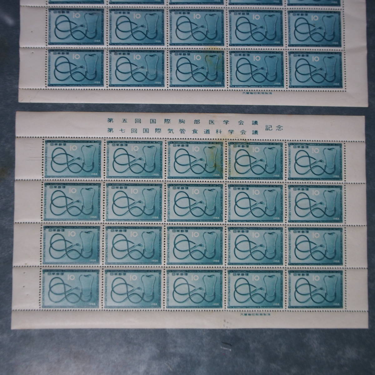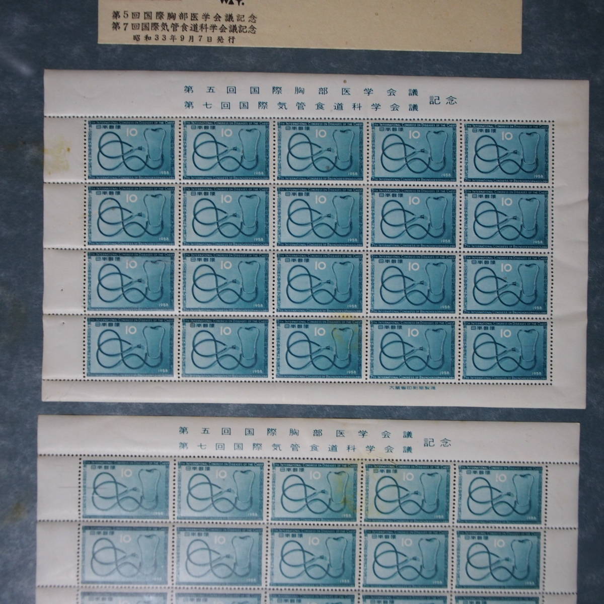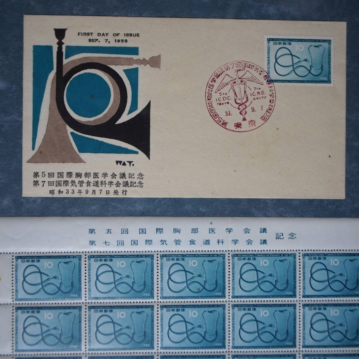 状態良好 !! 1958.9.7. 発行「国際胸部医学・気管食道科学会議記念 ( 聴診器 )」の20枚シート切手×2枚・ 「初日カード」×1枚 セット品