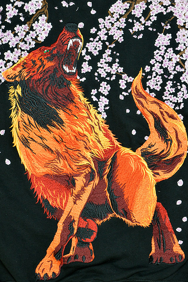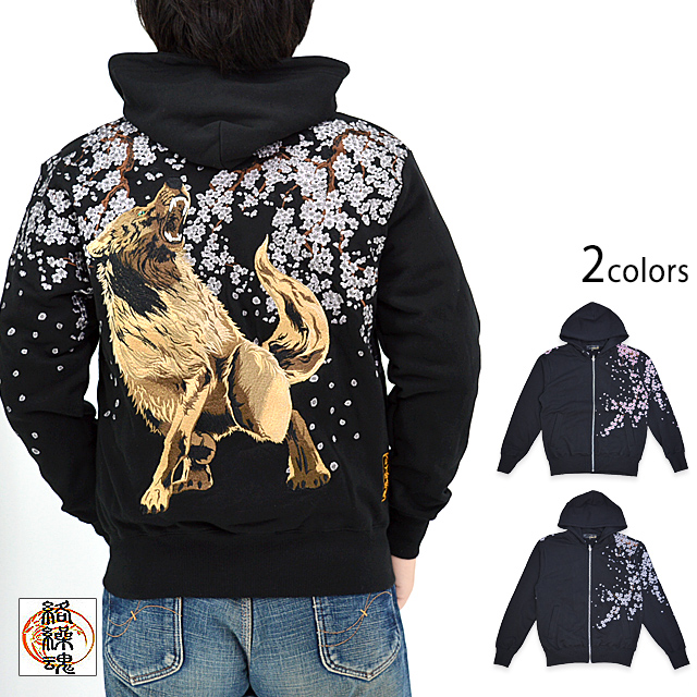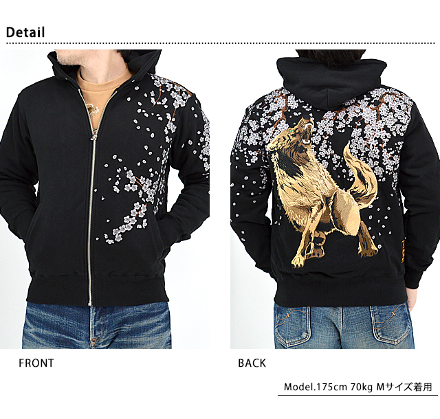 絡繰魂さんから「粋 桜狼咆哮スウェットジップパーカー(234007)」のご紹介です。 今回は長く着まわしていただくことの出来る、裏毛タイプのスウェットパーカーが登場しました。 重みすら感じる程の刺繍を豪華に使用した、存在感抜群の逸品に仕上がっております。 今回モチーフの主役に採用されたのは、近年人気を博している狼柄。 バックにしっかり柄を入れている分、フロントはシンプルにデザインし、メリハリをつけました。 身頃から袖にかけて、美しい桜が描かれています。 フロントはジップアップ仕様。 | |||||||||||||||||||||||||