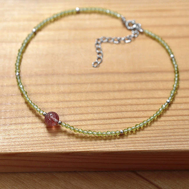 ●金属素材:シルバー925(ビーズ)、ステンレス(留め金具)。●ストーン:ペリドット、直径約2mm,ストロベリークリスタル、直径約6mm。●天然物なので、極めて少ないですが微細な天然傷の残ているところがあります。予めご了承ください。●サイズ:長さ23cm、 アジャスター4cm、全長約27cm。