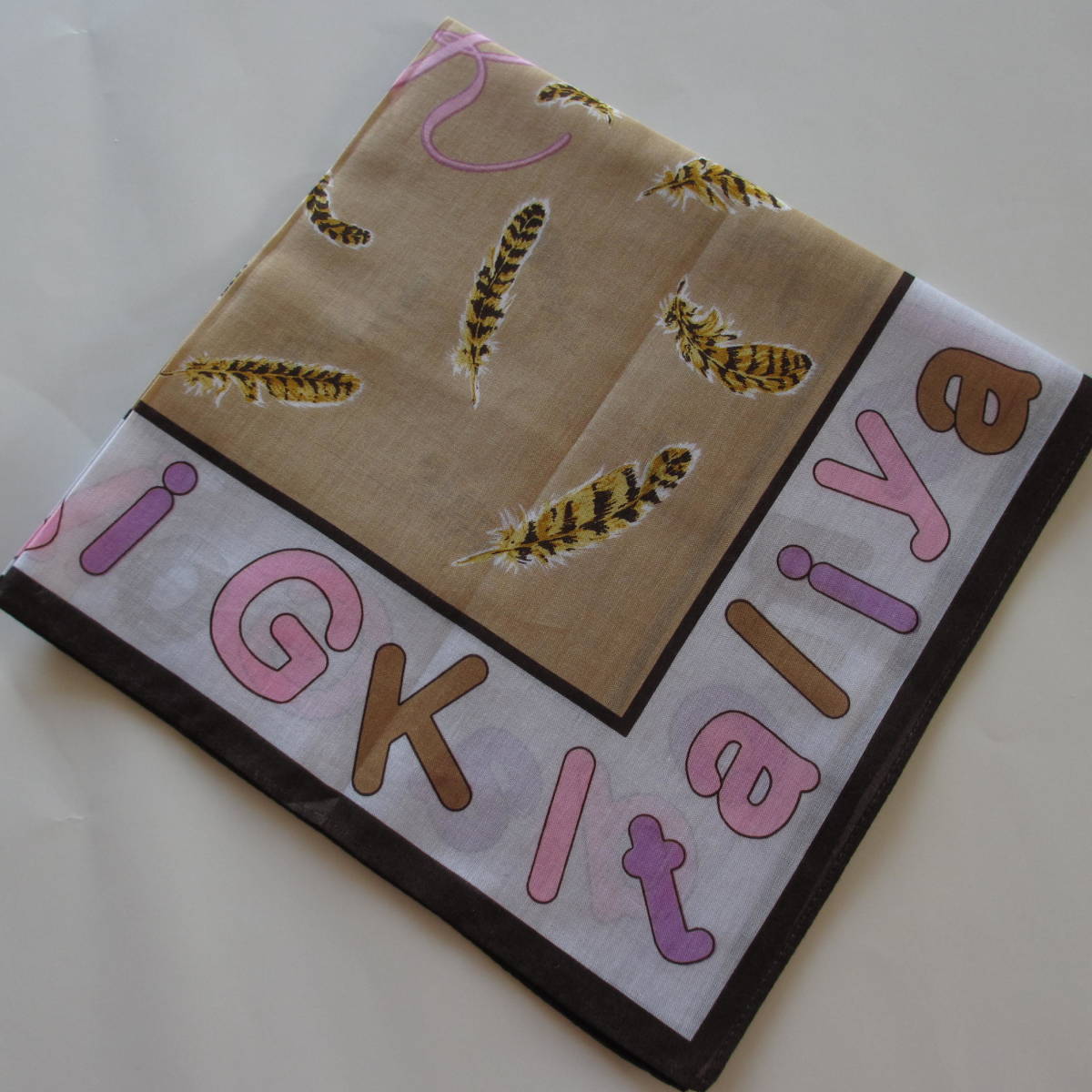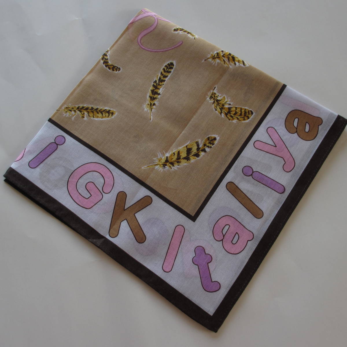 ベージュ色地とグレー色地に伊太利屋の英字のデザインのハンカチです。