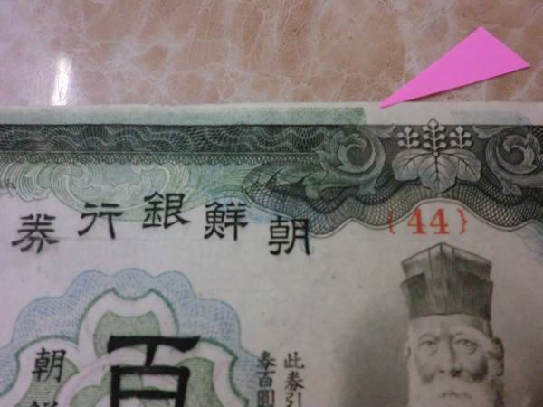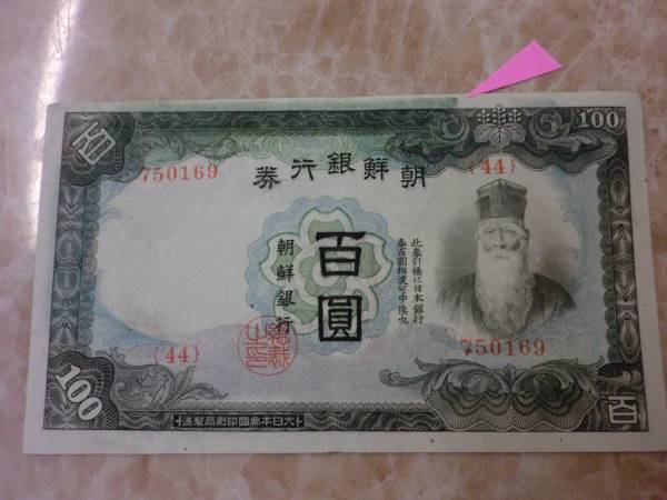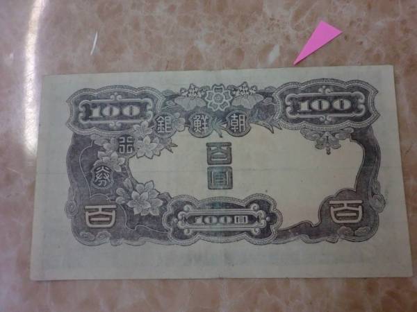 朝鮮銀行券 朝甲100円券で下地の印刷のズレ有りです。