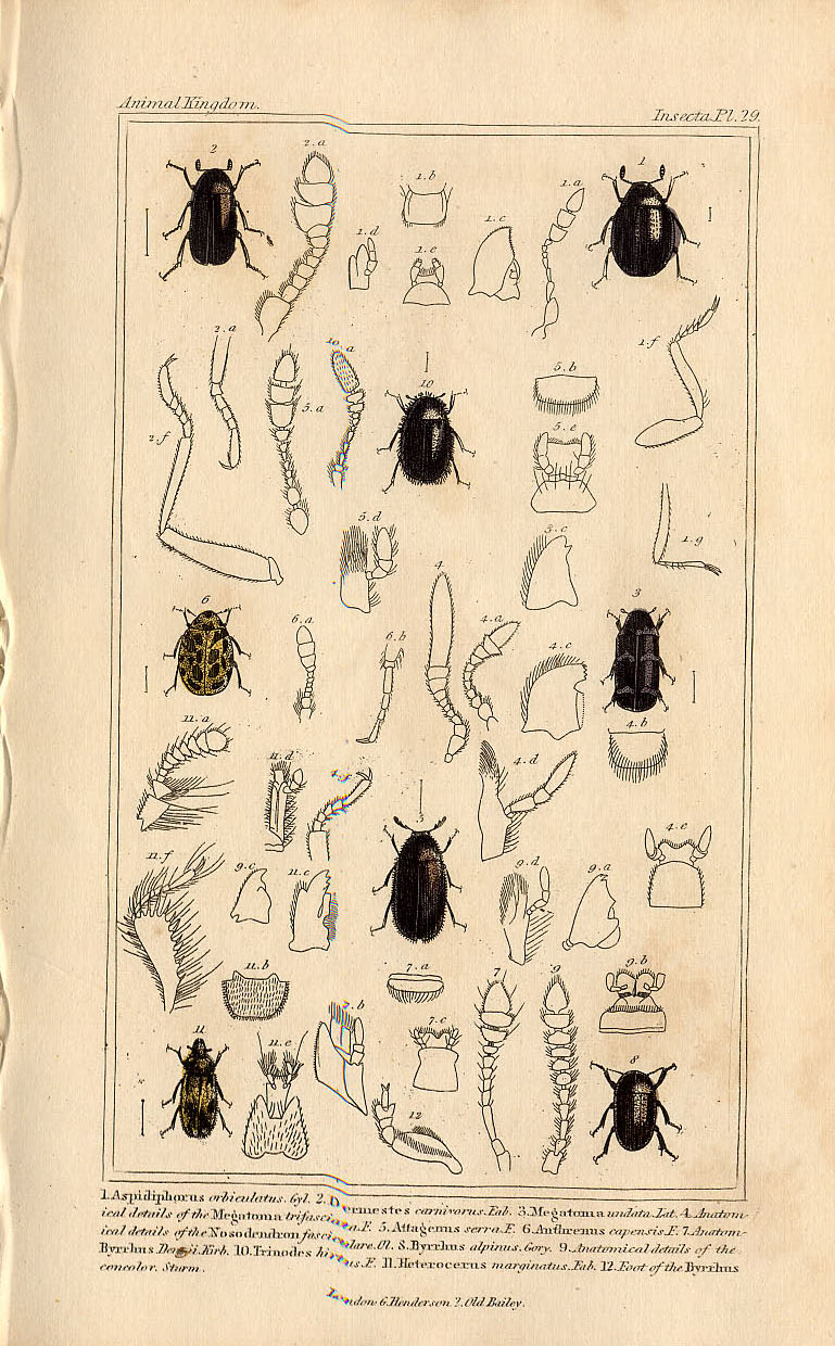 1837年 キュヴィエ 手彩色 鋼版画 マルヒメキノコムシの一種 ネアカカツオブシムシ ナガドロムシの一種 博物画