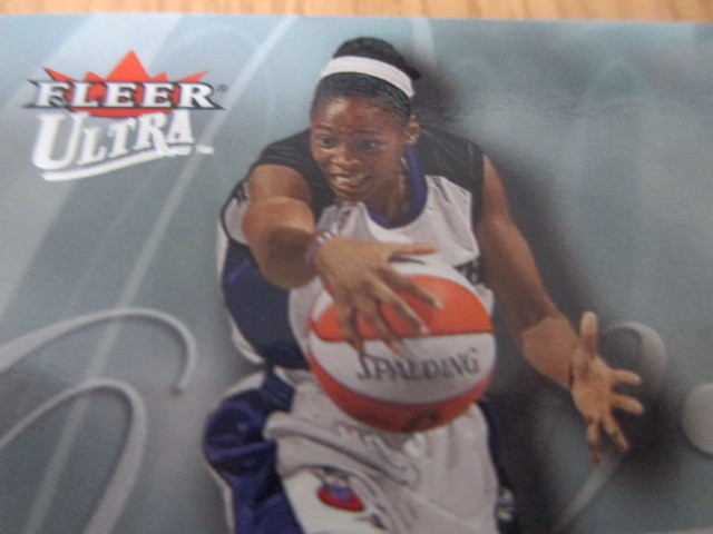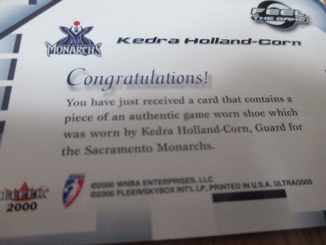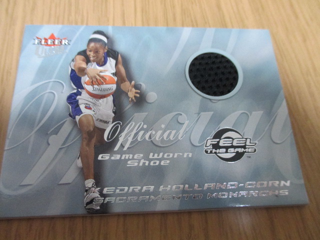 WNBAのサクラメント・モナークス所属のケドラが実際のWNBAの試合で使用したシューズの一部がインサートされたカードです。ケドラはジョージア大学で活躍して1997年のユニバーシアード世界大会でアメリカ代表で金メダル獲得に貢献。またWNBAでも活躍してデトロイト・ショック所属時に優勝に貢献したアメリカ女子バスケのスター選手でした。
