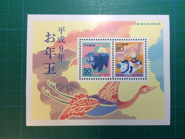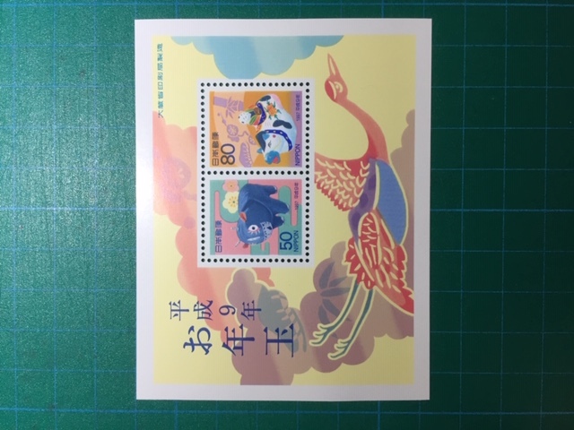 平成9年の丑年、お年玉切手シートです。この年の切手シートは、50円切手と80円切手の組み合わせで、極めて珍しいレアモノです。平成も終わり、一生もののメモリアルコレクションとして永久保存しておくつもりでしたが、今回、都合によりやむなく手放すことにしました。